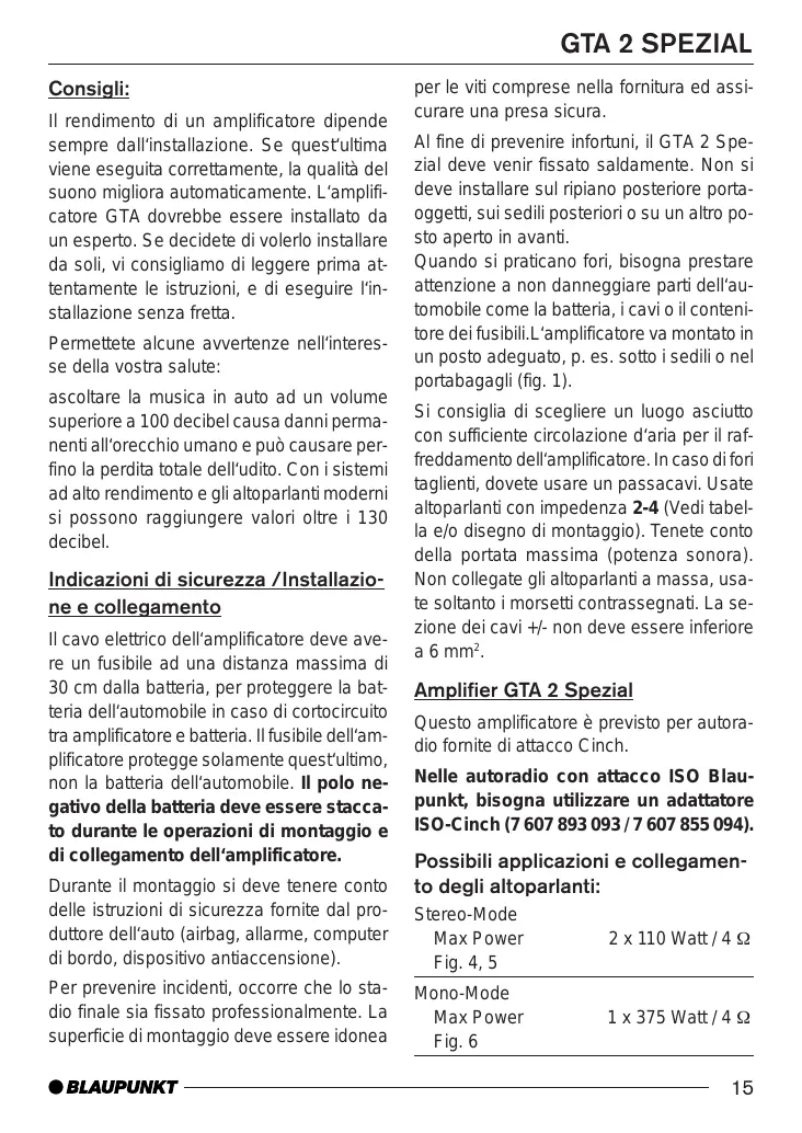 GTA 2 SPEZIAL Consigli: Il rendimento di un amplificatore dipende sempre dall‘installazione. Se quest‘ultima viene eseguita correttamente, la qualità del suono migliora automaticamente. L‘amplificatore GTA dovrebbe essere installato da un esperto. Se decidete di volerlo installare da soli, vi consigliamo di leggere prima attentamente le istruzioni, e di eseguire l‘installazione senza fretta. Permettete alcune avvertenze nell‘interesse della vostra salute: ascoltare la musica in auto ad un volume superiore a 100 decibel causa danni permanenti all‘orecchio umano e può causare perfino la perdita totale dell‘udito. Con i sistemi ad alto rendimento e gli altoparlanti moderni si possono raggiungere valori oltre i 130 decibel.