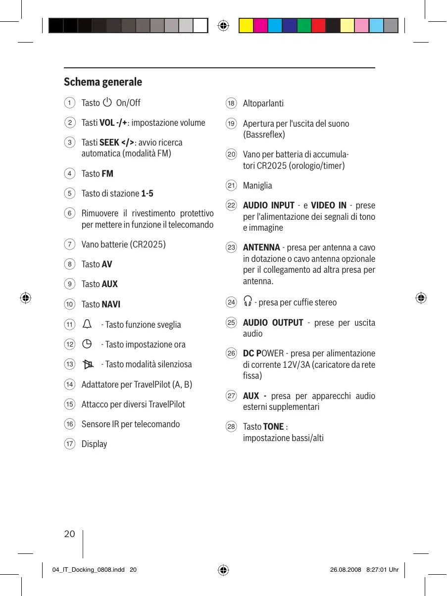 Funzionamento Uso conforme alle norme L'apparecchio è concepito per il collegamento stazionario di TravelPilot 300 / 500 e 700. Esso dispone di una radio RDS integrata con orologio e funzione sveglia. Inoltre la batteria viene caricata all'interno del TravelPilot da collegare. Diverse possibilità di collegamento sul lato posteriore permettono un impiego versatile.