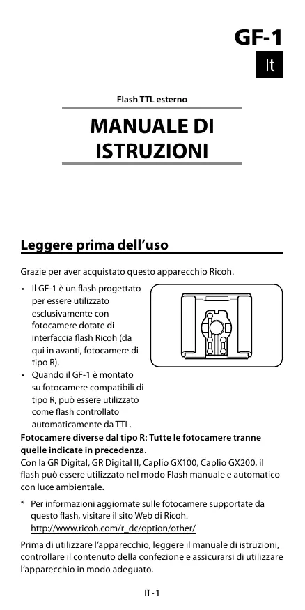 MANUALE DI ISTRUZIONI Leggere prima dell’uso Grazie per aver acquistato questo apparecchio Ricoh. • Il GF-1 è un flash progettato per essere utilizzato esclusivamente con fotocamere dotate di interfaccia flash Ricoh (da qui in avanti, fotocamere di tipo R). • Quando il GF-1 è montato su fotocamere compatibili di tipo R, può essere utilizzato come flash controllato automaticamente da TTL. Fotocamere diverse dal tipo R: Tutte le fotocamere tranne quelle indicate in precedenza. Con la GR Digital, GR Digital II, Caplio GX100, Caplio GX200, il flash può essere utilizzato nel modo Flash manuale e automatico con luce ambientale. * Per informazioni aggiornate sulle fotocamere supportate da questo flash, visitare il sito Web di Ricoh. http://www.ricoh.com/r_dc/option/other/ Prima di utilizzare l’apparecchio, leggere il manuale di istruzioni, controllare il contenuto della confezione e assicurarsi di utilizzare l’apparecchio in modo adeguato. IT -