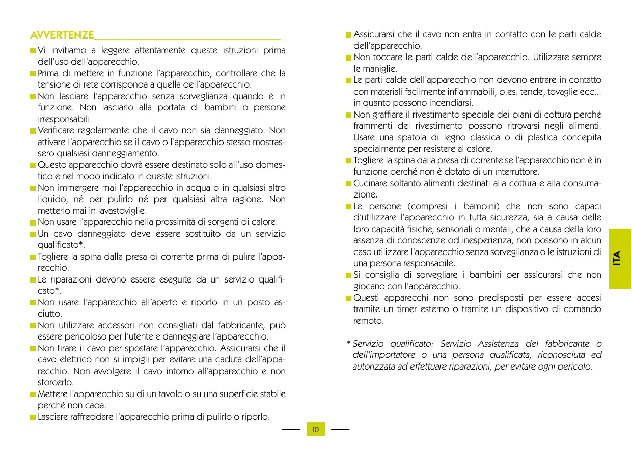 * Servizio qualificato: Servizio Assistenza del fabbricante o dell'importatore o una persona qualificata, riconosciuta ed autorizzata ad effettuare riparazioni, per evitare agli pericolo.