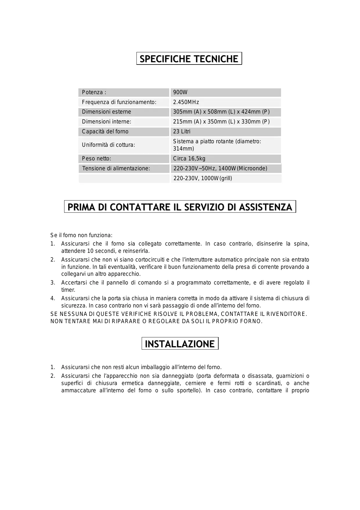 MANUTENZIONE E PULIZIA ---------------------------------------------------------------------------------------------------------------- 13 SPECIFICHE TECNICHE Potenza : 900W Frequenza di funzionamento: 2.450MHz Dimensioni esterne 305mm (A) x 508mm (L) x 424mm (P) Dimensioni interne: 215mm (A) x 350mm (L) x 330mm (P) Capacità del forno 23 Litri Uniformità di cottura: Sistema a piatto rotante (diametro: 314mm) Peso netto: Circa 16,5kg Tensione di alimentazione: 220-230V~50Hz, 1400W(Microonde) 220-230V, 1000W(grill) PRIMA DI CONTATTARE IL SERVIZIO DI ASSISTENZA Se il forno non funziona: