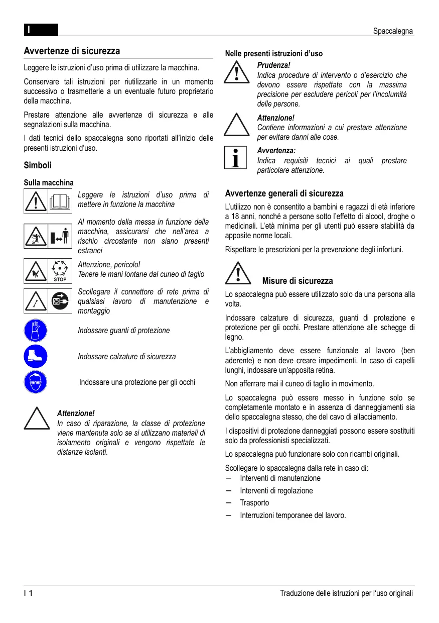 Avvertenze di sicurezza Leggere le istruzioni d’uso prima di utilizzare la macchina. Conservare tali istruzioni per riutilizzarle in un momento successivo o trasmetterle a un eventuale futuro proprietario della macchina. Prestare attenzione alle avvertenze di sicurezza e alle segnalazioni sulla macchina. I dati tecnici dello spaccalegna sono riportati all’inizio delle presenti istruzioni d’uso.