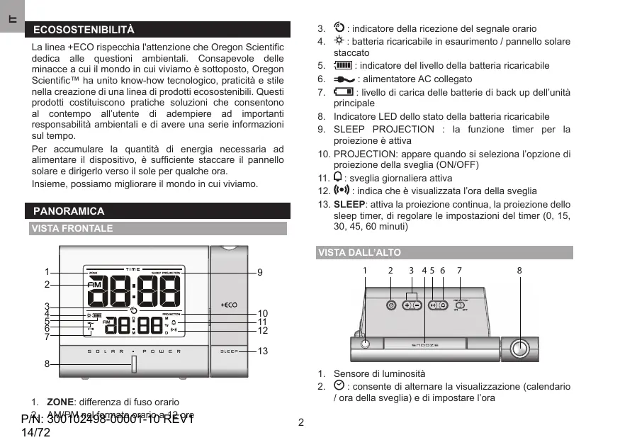 PANORAMICA VISTA FRONTALE : indicatore della ricezione del segnale orario : batteria ricaricabile in esaurimento / pannello solare staccato : indicatore del livello della batteria ricaricabile : alimentatore AC collegato : livello di carica delle batterie di back up dell’unità principale Indicatore LED dello stato della batteria ricaricabile SLEEP PROJECTION : la funzione timer per la proiezione è attiva PROJECTION: appare quando si seleziona l’opzione di proiezione della sveglia (ON/OFF) : sveglia giornaliera attiva : indica che è visualizzata l’ora della sveglia SLEEP: attiva la proiezione continua, la proiezione dello sleep timer, di regolare le impostazioni del timer (0, 15, 30, 45, 60 minuti)
