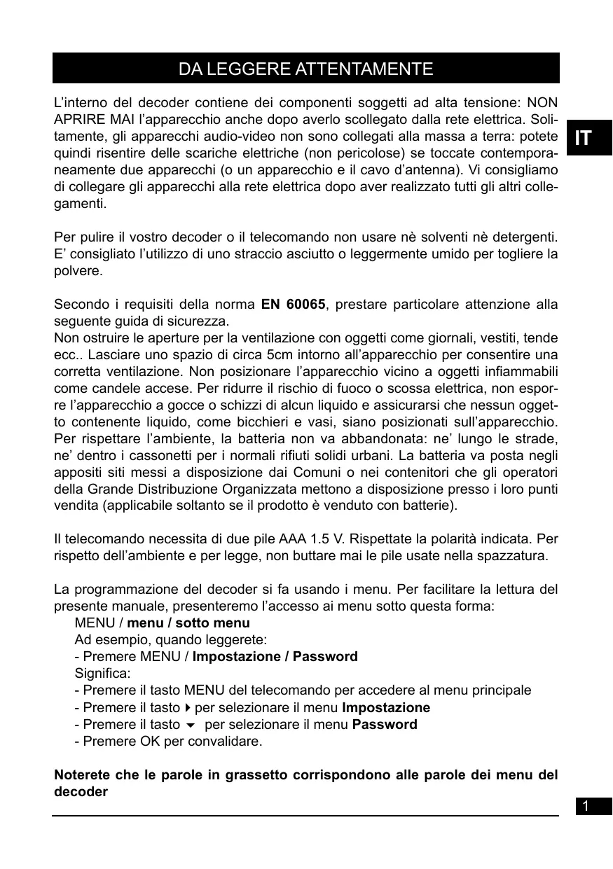 FR Lorsque vous rencontrez un mot que vous ne comprenez pas, allez voir dans la partie «Glossaire» en fin de notice, la plupart des mots techniques sont expliqués brièvement. Pour nettoyer votre terminal ou sa télécommande, n’employez ni solvant ni détergent. Un chiffon sec ou très légèrement humide sera parfait pour enlever la poussière. Conformément aux obligations faites par le respect de la norme EN 60065, nous attirons votre attention sur les éléments de sécurité suivants. Il convient de ne pas obstruer les ouvertures d’aération avec des objets tels que journaux, nappes, rideaux, etc. Une distance minimale de 5 cm est requise autour de l’appareil pour assurer une aération suffisante. Il convient de ne pas placer sur l’appareil, ou à proximité, des sources de flammes nues telles que des bougies allumées. L’appareil ne doit pas être exposé à des égouttements d’eau ou des éclaboussures et de plus, aucun objet rempli de liquide tel que des vases ne doit être placé sur l’appareil. Lorsque la prise d’alimentation est utilisée comme dispositif de déconnexion, ce dispositif doit demeurer aisément accessible. La télécommande nécessite deux piles AAA 1.5V. Respectez la polarité indiquée dans le logement. Dans un respect de l’environnement et de la loi, ne jetez jamais les piles usagées avec les ordures ménagères. Rapportez-les à votre point de vente où vous trouverez des containers pour piles usagées. Ce symbole est utilisé à plusieurs reprises dans cette notice. Prêtez toute l’attention nécessaire au texte important qu’il repère.