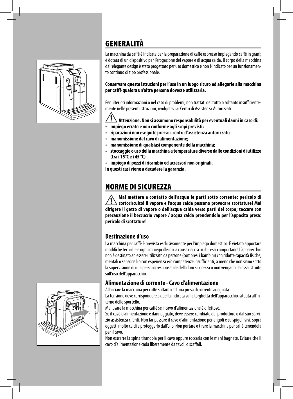 • Sécurité des appareils électrodomestiques et analogues - Prescriptions générales EN 60335-1 (2002) + A1(2004) + A2(2006) + A11(2004) + A12 (2006) +A13 (2008) • Sécurité des appareils électrodomestiques et analogues Partie 2-15 - Règles particulières pour les appareils de chauffage des liquides EN 60 335-2-15 (2002) + A1(2005) • Appareils électrodomestiques et analogues. Champs électro-magnétiques Méthodes d’évaluation et de mesure EN 50366 (2003) + A1 (2006). • Sécurité des appareils électrodomestiques et analogues - Partie 2-14 Règles particulières pour pulvérisateurs et moulins à café EN 60335-2-14 (2006). • Limites et méthodes de mesure des perturbations radioélectriques produites par les appareils électrodomestiques ou analogues comportant des moteurs ou des dispositifs thermiques, par les outils électriques et par les appareils électriques analogues - EN 55014-1 (2006). • Compatibilité électromagnétique (EMC) Partie 3, Limites - Section 2 : Limites pour les émissions de courant harmonique (courant appelé par les appareils ≤ 16 A par phase) - EN 61000-3-2 (2006) • Compatibilité électromagnétique (EMC) Partie 3, Limites - Section 3 : Limitation des variations, des fluctuations de tension et du papillotement dans les réseaux publics d’alimentation basse tension ayant un courant assigné ≤ 16A par phase et non soumis à un raccordement conditionnel. EN 61000-3-3 (1995) + corr.(1997) + A1(2001) + A2 (2005). • Exigences pour les appareils électrodomestiques, outillages électriques et appareils analogues. Norme de famille de produits EN 55014-2 (1997) + A1 (2001) Selon les dispositions des directives: EC 2006/95 , EC 2004/108. R & D Manager Gaggio Montano li, 28/04/2009 Para más información o en caso de problemas no mencionados o expuestos de manera incompleta en estas instrucciones, contactar con los Centros de Asistencia Autorizados. ¡Atención! Se declina toda responsabilidad por posibles daños en caso de: uso indebido y no conforme con las instrucciones de uso; reparaciones realizadas en centros de asistencia no autorizados; alteración del cable de alimentación; alteración de cualquier componente de la máquina; almacenamiento o utilización de la máquina a temperaturas no comprendidas entre los 15 y los 45 ºC; • utilización de repuestos y accesorios no originales. • • La tensión debe ser la misma que la que se indica en la placa del aparato, situada en la parte interior de la puerta de servicio. Nunca usar la máquina de café si el cable de alimentación es defectuoso. Si el cable de alimentación está dañado, solicitar al fabricante o al servicio de asistencia clientes la sustitución del mismo. Procurar que el cable de alimentación no pase por esquinas o cantos agudos ni por encima de objetos muy calientes. Protegerlo del aceite. No llevar ni tirar de la máquina agarrándola por el cable. No desenchufar la máquina tirando del cable ni tocar el enchufe con las manos mojadas. Procurar que el cable de alimentación no cuelgue libremente de mesas o estanterías.