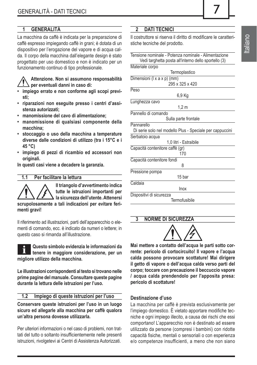 DATI TECNICI Il costruttore si riserva il diritto di modificare le caratteristiche tecniche del prodotto. Tensione nominale - Potenza nominale - Alimentazione Vedi targhetta posta all'interno dello sportello (3) Materiale corpo Termoplastico Dimensioni (l x a x p) (mm) 295 x 325 x 420 Peso 6,9 Kg Lunghezza cavo 1,2 m Pannello di comando Sulla parte frontale Pannarello Di serie solo nel modello Plus - Speciale per cappuccini Serbatoio acqua 1,0 litri - Estraibile Capacità contenitore caffè (gr) Capacità contenitore fondi Pressione pompa 15 bar Caldaia Inox Dispositivi di sicurezza Termofusibile