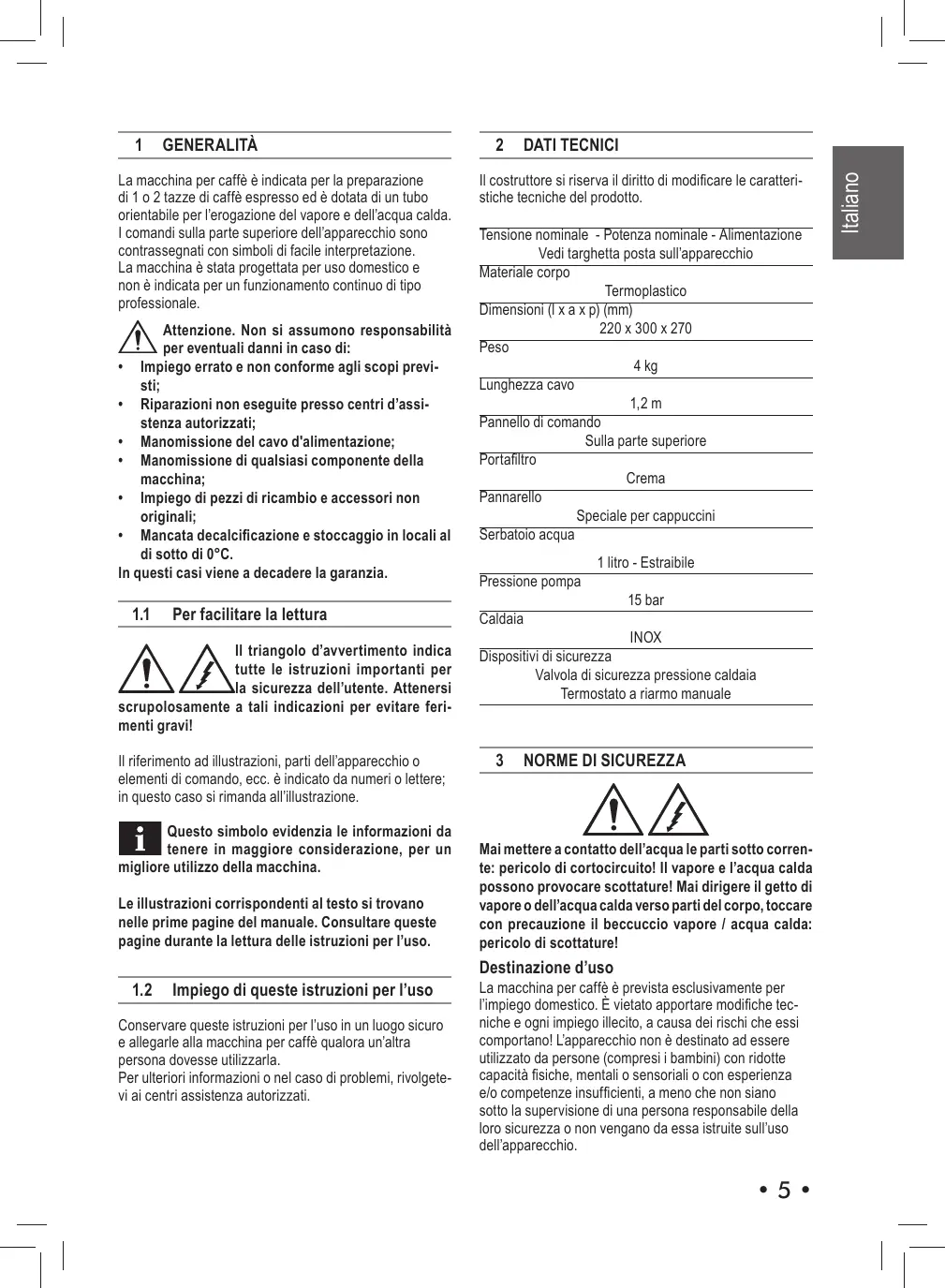 2 DATITECNICI La macchina per caffè & indicata per la preparazione di 1 0 2 tazze di caffè espresso ed à dotata di un tubo orientable per l'erogazione del vapore e dell acqua calda. 1 comandi sulla parte superiore dellapparecchio sono contrassegnati con simboli di facile interpretazione