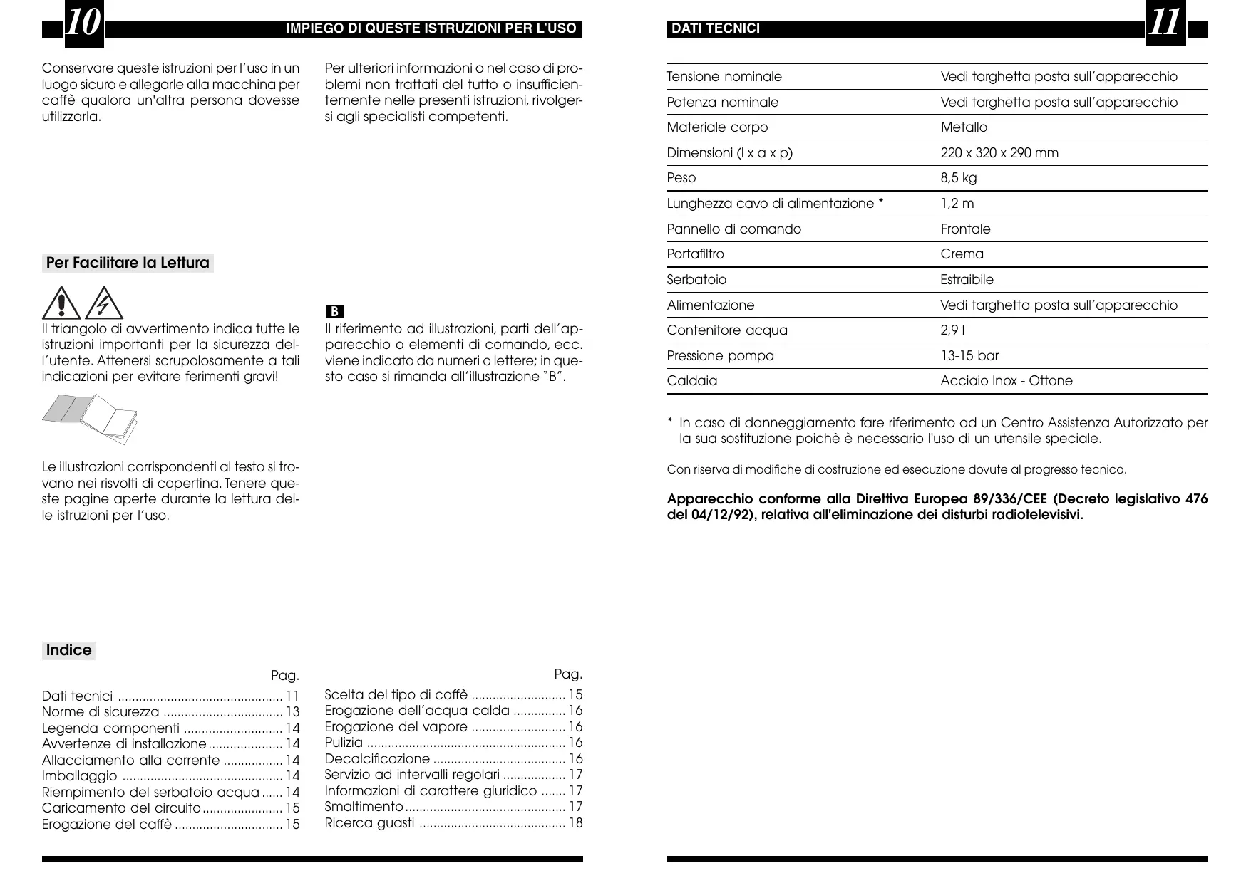 - In caso di danneggiamento fare riferimento ad un Centro Assistenza Autorizzato per la sua sostituzione poichè è necessario l'uso di un utensile speciale. Le illustrazioni corrispondenti al testo si trovano nei risvolti di copertina. Tenere queste pagine aperte durante la lettura delle istruzioni per l’uso. Con riserva di modifiche di costruzione ed esecuzione dovute al progresso tecnico. Apparecchio conforme alla Direttiva Europea 89/336/CEE (Decreto legislativo 476 del 04/12/92), relativa all'eliminazione dei disturbi radiotelevisivi. Indice Pag. Pag. Dati tecnici ............................................... 11 Norme di sicurezza .................................. 13 Legenda componenti ............................ 14 Avvertenze di installazione ..................... 14 Allacciamento alla corrente ................. 14 Imballaggio .............................................. 14 Riempimento del serbatoio acqua ...... 14 Caricamento del circuito ....................... 15 Erogazione del caffè ............................... 15 Scelta del tipo di caffè ........................... 15 Erogazione dell’acqua calda ............... 16 Erogazione del vapore ........................... 16 Pulizia ......................................................... 16 Decalcificazione ...................................... 16 Servizio ad intervalli regolari .................. 17 Informazioni di carattere giuridico ....... 17 Smaltimento .............................................. 17 Ricerca guasti .......................................... 18