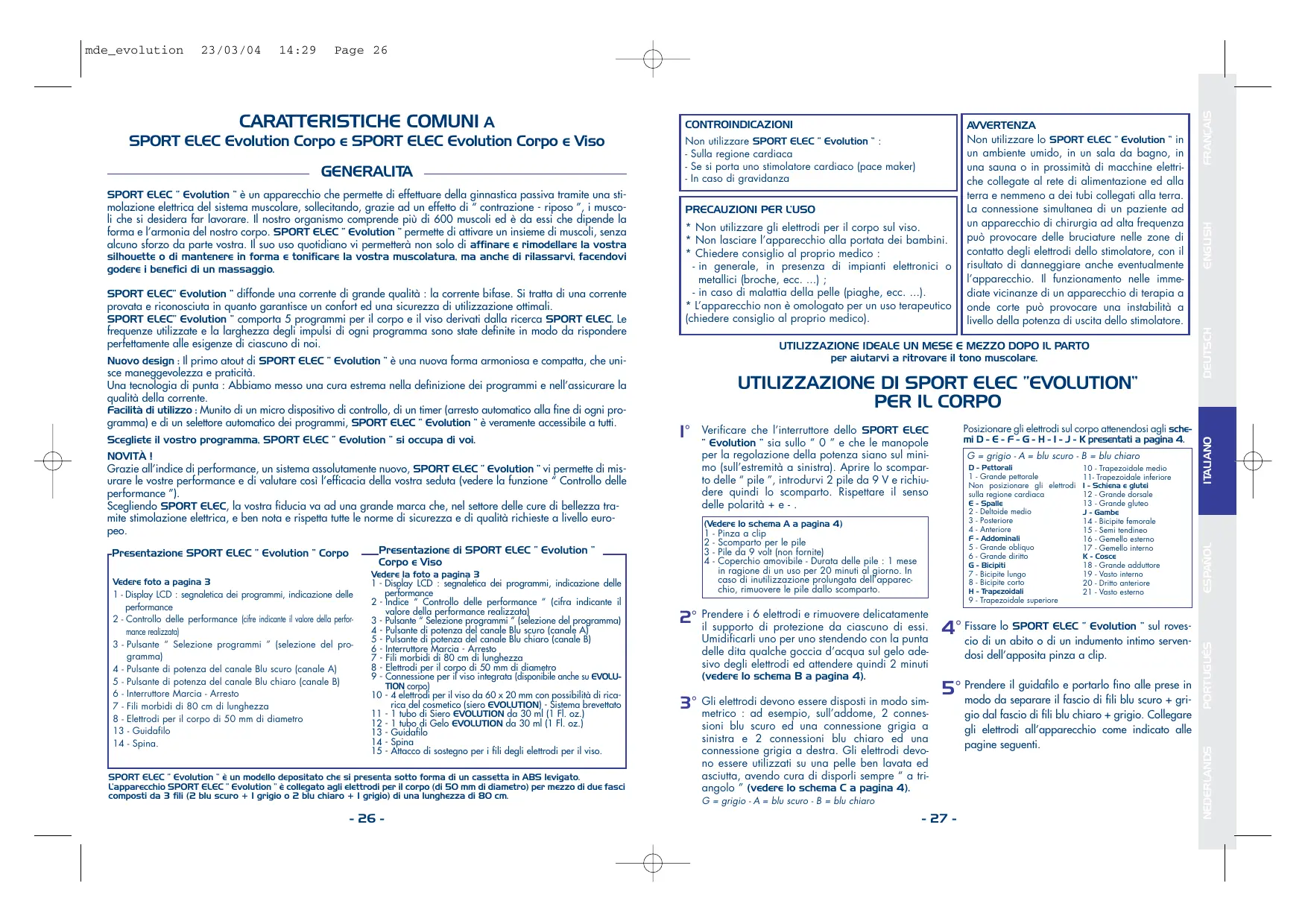 ENGLISH Non utilizzare SPORT ELEC “ Evolution ” : - Sulla regione cardiaca - Se si porta uno stimolatore cardiaco (pace maker) - In caso di gravidanza DEUTSCH GENERALITA SPORT ELEC “ Evolution ” è un apparecchio che permette di effettuare della ginnastica passiva tramite una stimolazione elettrica del sistema muscolare, sollecitando, grazie ad un effetto di “ contrazione - riposo ”, i muscoli che si desidera far lavorare. Il nostro organismo comprende più di 600 muscoli ed è da essi che dipende la forma e l’armonia del nostro corpo. SPORT ELEC “ Evolution ” permette di attivare un insieme di muscoli, senza alcuno sforzo da parte vostra. Il suo uso quotidiano vi permetterà non solo di affinare e rimodellare la vostra silhouette o di mantenere in forma e tonificare la vostra muscolatura, ma anche di rilassarvi, facendovi godere i benefici di un massaggio. CONTROINDICAZIONI ITALIANO
