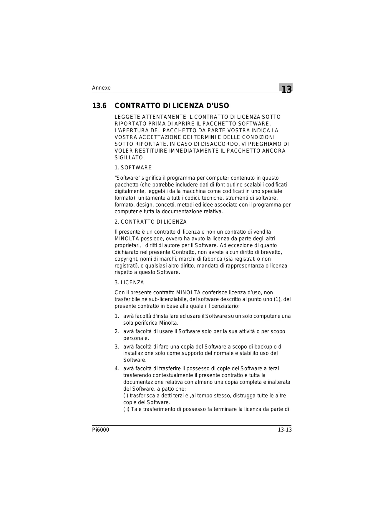 trasferendo contestualmente il presente contratto e tutta la documentazione relativa con almeno una copia completa e inalterata del Software, a patto che: (i) trasferisca a detti terzi e ,al tempo stesso, distrugga tutte le altre copie del Software. (ii) Tale trasferimento di possesso fa terminare la licenza da parte di Pi6000 13-13 Annexe