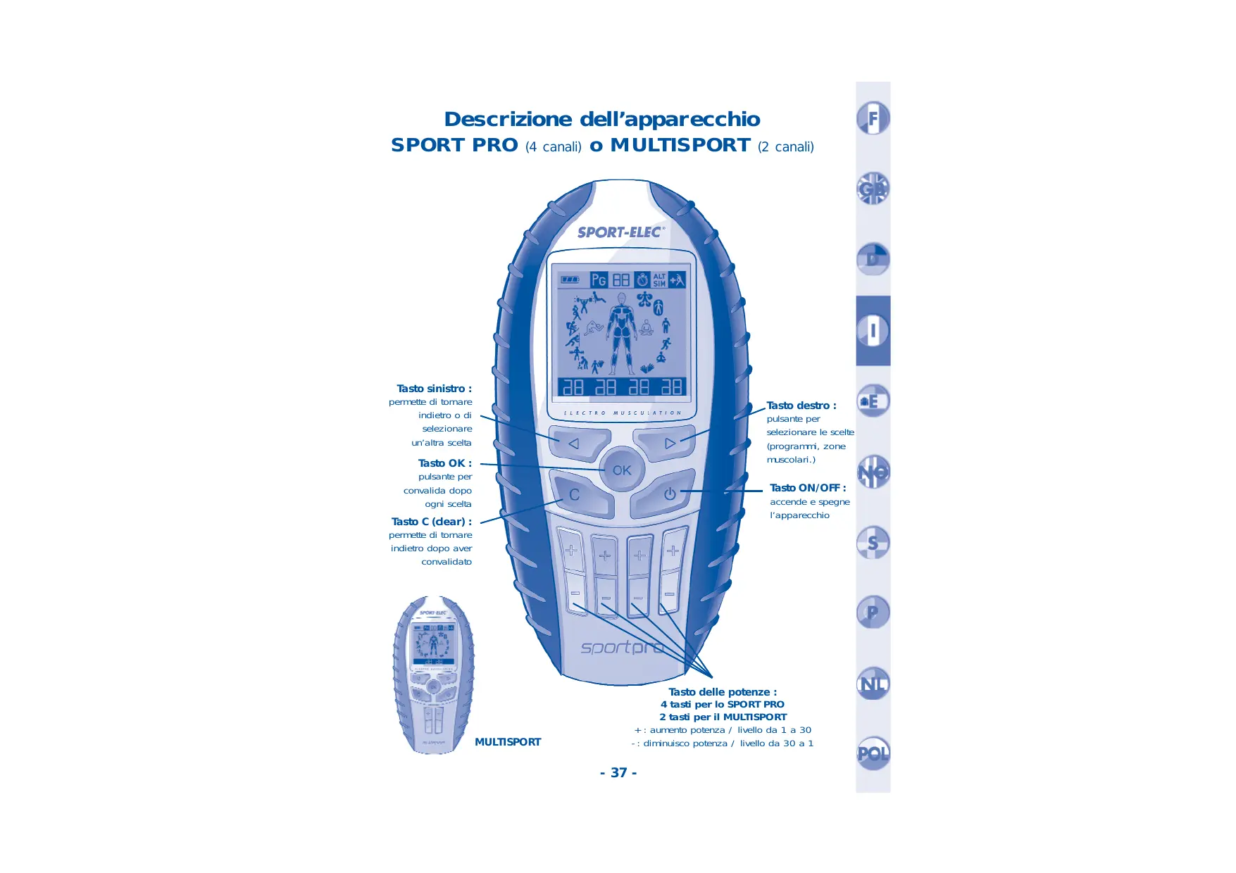 Descrizione dell’apparecchio SPORT PRO (4 canali) o MULTISPORT Tasto sinistro : permette di tornare indietro o di selezionare un’altra scelta (2 canali) Tasto destro : pulsante per selezionare le scelte (programmi, zone muscolari.) Tasto OK : pulsante per convalida dopo ogni scelta Tasto ON/OFF : accende e spegne l’apparecchio Tasto C (clear) : permette di tornare indietro dopo aver convalidato MULTISPORT Tasto delle potenze : 4 tasti per lo SPORT PRO 2 tasti per il MULTISPORT + : aumento potenza / livello da 1 a 30 - : diminuisco potenza / livello da 30 a 1