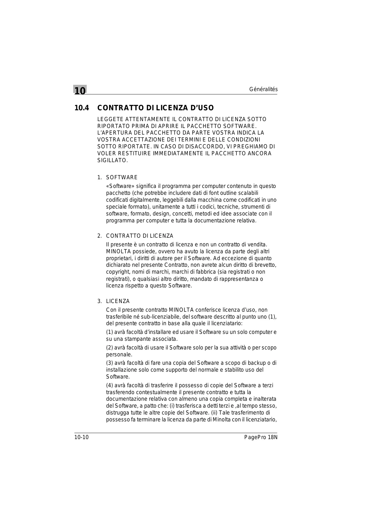 Con il presente contratto MINOLTA conferisce licenza d’uso, non trasferibile né sub-licenziabile, del software descritto al punto uno (1), del presente contratto in base alla quale il licenziatario: (1) avrà facoltà d’installare ed usare il Software su un solo computer e su una stampante associata. (2) avrà facoltà di usare il Software solo per la sua attività o per scopo personale. (3) avrà facoltà di fare una copia del Software a scopo di backup o di installazione solo come supporto del normale e stabilito uso del Software. (4) avrà facoltà di trasferire il possesso di copie del Software a terzi trasferendo contestualmente il presente contratto e tutta la documentazione relativa con almeno una copia completa e inalterata del Software, a patto che: (i) trasferisca a detti terzi e ,al tempo stesso, distrugga tutte le altre copie del Software. (ii) Tale trasferimento di possesso fa terminare la licenza da parte di Minolta con il licenziatario, 10-10 PagePro 18N Généralités