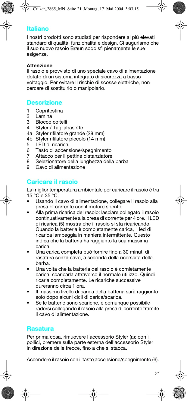 Scarica le istruzioni per il tuo Tagliacapelli in formato PDF gratuitamente! Trova il tuo manuale CRUZER3 2878 - BRAUN e riprendi in mano il tuo dispositivo elettronico. In questa pagina sono pubblicati tutti i documenti necessari per l'utilizzo del tuo dispositivo. CRUZER3 2878 del marchio BRAUN.