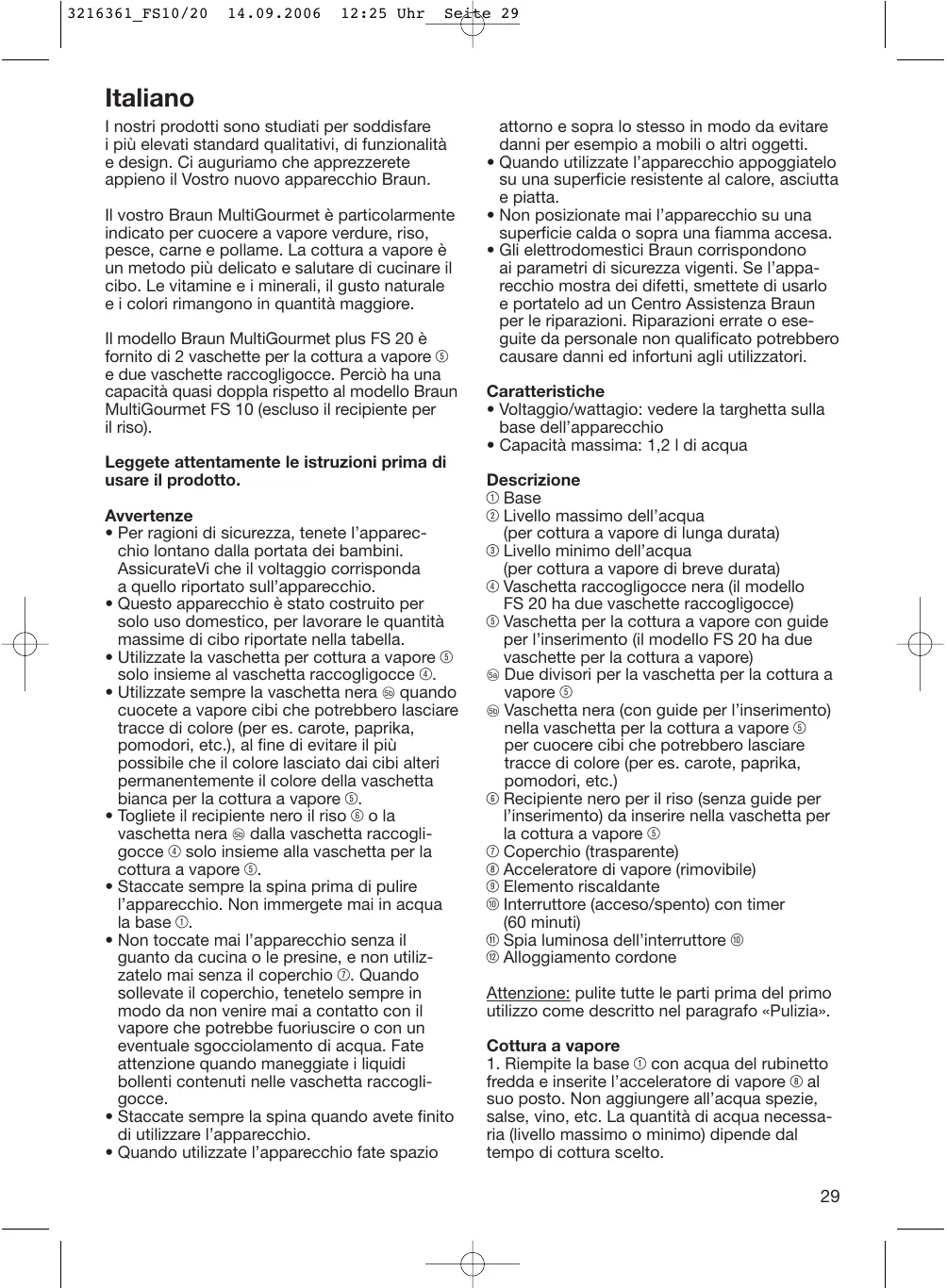 12:25 Uhr Seite 29 Italiano I nostri prodotti sono studiati per soddisfare i più elevati standard qualitativi, di funzionalità e design. Ci auguriamo che apprezzerete appieno il Vostro nuovo apparecchio Braun. Il vostro Braun MultiGourmet è particolarmente indicato per cuocere a vapore verdure, riso, pesce, carne e pollame. La cottura a vapore è un metodo più delicato e salutare di cucinare il cibo. Le vitamine e i minerali, il gusto naturale e i colori rimangono in quantità maggiore. Il modello Braun MultiGourmet plus FS 20 è fornito di 2 vaschette per la cottura a vapore 5 e due vaschette raccogligocce. Perciò ha una capacità quasi doppla rispetto al modello Braun MultiGourmet FS 10 (escluso il recipiente per il riso). Leggete attentamente le istruzioni prima di usare il prodotto. Avvertenze