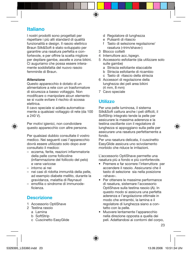 Italiano I nostri prodotti sono progettati per rispettare i più alti standard di qualità funzionalità e design. Il rasoio elettrico Braun Silk&Soft è stato sviluppato per garantire una rasatura perfetta e confortevole, e per offrire la scelta migliore per depilare gambe, ascelle e zona bikini. Ci auguriamo che possa essere interamente soddisfatta del nuovo rasoio femminile di Braun. Attenzione Questo apparecchio è dotato di un alimentatore a rete con un trasformatore di sicurezza a basso voltaggio. Non modificare o manipolare alcun elemento se si vuole evitare il rischio di scossa elettrica. Il cavo speciale si adatta automaticamente a qualsiasi voltaggio di rete (da 100 a 240 V). Per motivi igienici, non condividere questo apparecchio con altre persone. Per qualsiasi dubbio consultate il vostro medico. Nei seguenti casi l’apparecchio dovrà essere utilizzato solo dopo aver consultato il medico: – eczema, ferite, reazioni infiammatorie della pelle come follicoline (infiammazione del follicolo del pelo) e vene varicose – intorno ai nei – nei casi di ridotta immunità della pelle, ad esempio diabete mellito, durante la gravidanza, malattia di Raynaud – emofilia o sindrome di immunodeficienza. Descrizione 1 Accessorio OptiShave 2 Testina rasoio a Lamina b SoftStrip c Cuscinetto EasyGlide 5329395_LS5360.indd 23