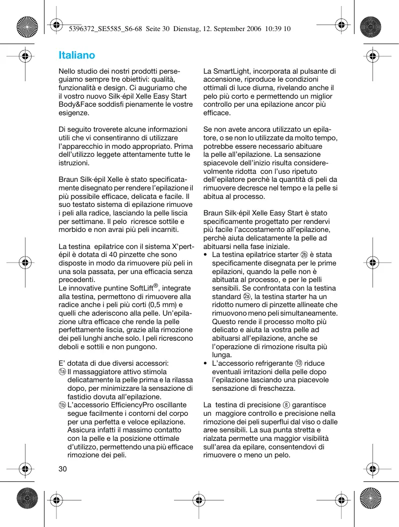 D) 5306372 SESSSS_S6-68 Seite 30 Dienstag, Italiano Nello studio dei nostri prodotti perse- guiamo sempre tre obiettivi: qualità, funzionalità e design. Ci auguriamo che il vostro nuovo Silk-épil Xelle Easy Start Body&Face soddisfi pienamente le vostre esigenze. Di seguito troverete alcune informazioni utili che vi consentiranno di utilizzare l'apparecchio in modo appropriato. Prima dell’utilizzo leggete attentamente tutte le istruzioni. Braun Silk-épil Xelle à stato specificata- mente disegnato per rendere l'epilazione il più possible efficace, delicata e facile. 11 So testato sistema di epilazione rimuove ï peli alla radice, lasciando la pelle liscia per settimane. Il pelo ricresce sottile e morbido e non avrai più peli incarniti. La testina epilatrice con il sistema X'pert- épil à dotata di 40 pinzette che sono disposte in modo da rimuovere più peli in una sola passata, per una efficacia senza precedenti. Le innovative puntine SoftLift®, integrate alla testina, permettono di rimuovere alla radice anche i peli più corti (0,5 mm) e quelli che aderiscono alla pelle. Un'epila- zione uitra efficace che rende la pelle perfettamente liscia, grazie alla rimozione dei pelilunghi anche solo. | peliricrescono deboli e sottili e non pungono. E' dotata di due diversi accessori: @ I massaggiatore attivo stimola delicatamente la pelle prima e la rilassa dopo, per minimizzare la sensazione di fastidio dovuta all'epilazione. @ L'accessorio EficiencyPro oscillante segue faciimente i contorni del corpo per una perfetta e veloce epilazione. Assicura infatti il massimo contatto con la pelle e la posizione ottimale d'utlizzo, permettendo una piü efficace rimozione dei peli.