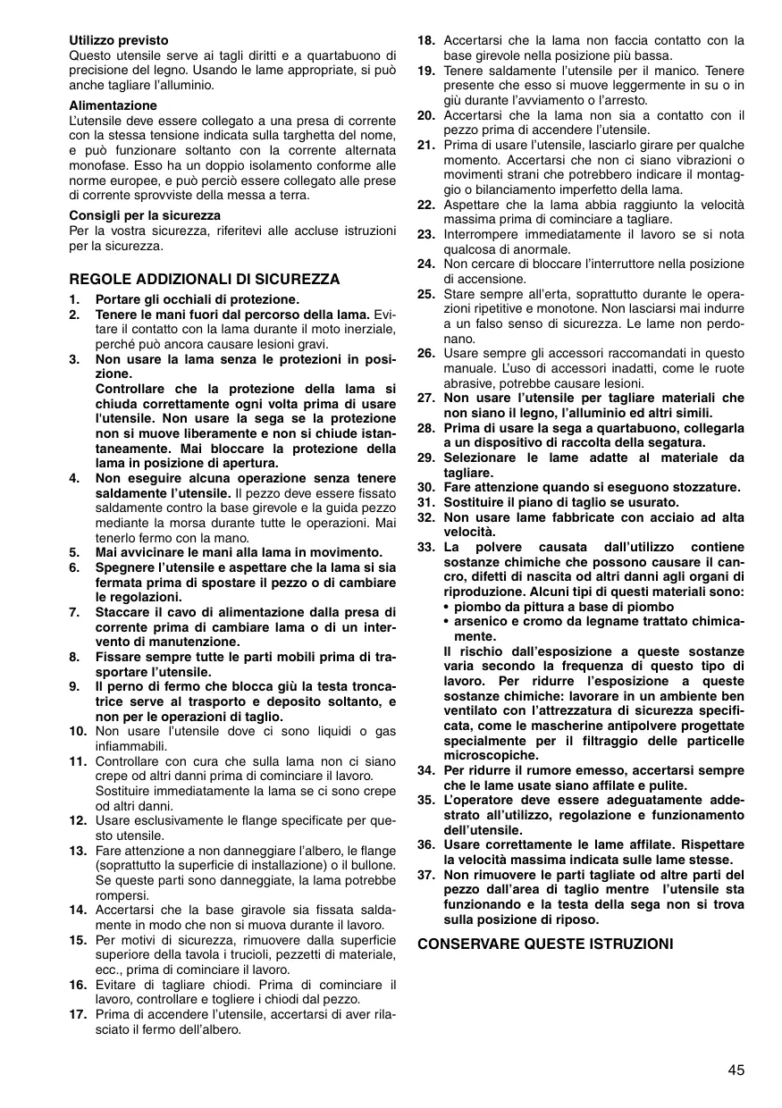 zioni ripetitive e monotone. Non lasciarsi mai indurre a un falso senso di sicurezza. Le lame non perdo- nano. Usare sempre gli accessori raccomandati in questo manuale. L'uso di accessori inadatti, come le ruote abrasive, potrebbe causare lesioni. Non usare l’utensile per tagliare materiali che non siano il legno, l'alluminio ed altri simili Prima di usare la sega a quartabuono, collegarla à un dispositivo di raccolta della segatura. Selezionare le lame adatte al materiale da tagliare. Fare attenzione quando si eseguono stozzature. Sostituire il piano di taglio se usurato. Non usare lame fabbricate con acciaio ad alta velocità. La polvere causata dallutilizzo contiene sostanze chimiche che possono causare il can- od altri danni agli organi di pi di Ir sono: + piombo da plttura a base di plombo + arsenico e cromo da legname trattato chimica- mente. Il rischio dall'esposizione a queste sostanze varia secondo la frequenza di questo lavoro. Per ridurre l'esposizione a queste sostanze chimiche: lavorare in un ambiente ben ventilato con l'attrezzatura di sicurezza specifi- cata, come le mascherine antipolvere progettate specialmente per il filtraggio delle particelle microscopiche. Per ridurre il rumore emesso, accertarsi sempre che le lame usate siano affilate e pulite. L'operatore deve essere adeguatamente adde- strato all’utilizzo, regolazione e funzionamento dell'utensile. Usare correttamente le lame affilate. Rispettare la velocità massima indicata sulle lame stesse. Non rimuovere le parti tagliate od altre parti del pezzo dall'area di taglio mentre l'uten: funzionando e la testa della sega non si trova sulla posizione di riposo.