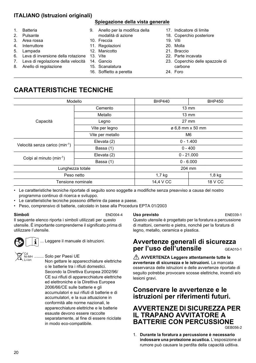 Uso previsto ENE039-1 Questo utensile à progettato per la foratura a percussione di mattoni, cemento e pietra, nonché per la foratura di legno, metallo, ceramica e plastica Avvertenze generali di sicurezza per l’uso dell’utensile GEA010-1 À AVVERTENZA Leggere attentamente tutte le avvertenze di sicurezza e le istruzioni. La mancata osservanza delle istruzioni e delle avvertenze riportate di seguito potrebbe provocare scosse elettriche, incendi e/o lesioni gravi. Conservare le avvertenze e le istruzioni per riferimenti futuri