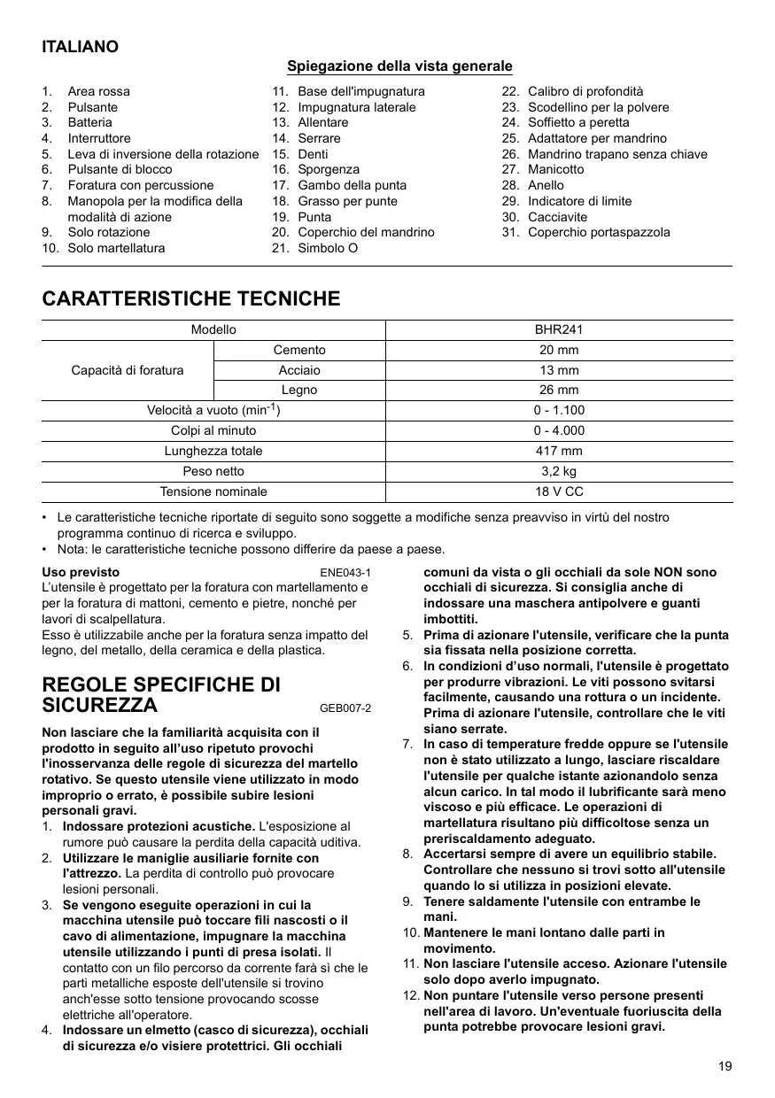 BHR241 - Martello demolitore MAKITA - Manuale utente e istruzioni gratuiti