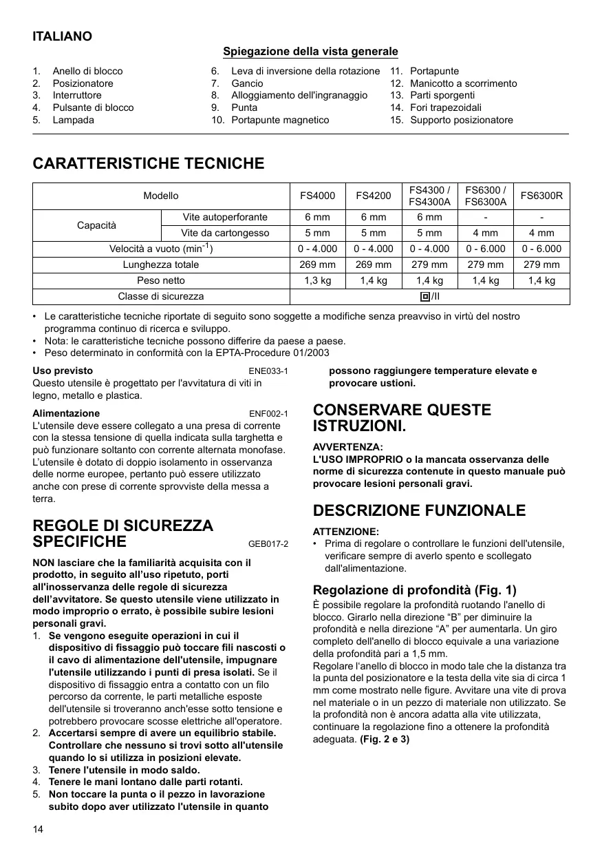 CARATTERISTICHE TECNICHE FS4300/ | FS6300/ Modello FS4000 | FS4200 | Soon | Fa6a0ga | F86800R Vite autoperforante 6mm 6 mm 6mm - - Capacità Vite da cartongesso 5mm 5 mm 5 mm 4 mm 4 mm Velocità a vuoto (min) 0-4.000 | 0-4.000 | 0-4.000 | 0-6.000 | 0-6.000 Lunghezza totale 269 mm | 269mm | 279mm | 279mm | 279mm Peso netto 13kg 14 kg T4kg 14 kg 14kg Classe di sicurezza Ai +_ Le caratteristiche tecniche riportate di seguito sono soggette a modifiche senza preavviso in virtü del nostro programma continuo di ricerca € sviluppo. + Nota: le caratteristiche tecniche possono differire da paese a paese. +_ Peso determinato in conformità con la EPTA-Procedure 01/2003 Uso previsto ENE033-1 Questo utensile à progettato per l'avvitatura di vit in legno, metallo e plastica Alimentazione ENFO02-1 L'utensile deve essere collegato a una presa di corrente con la stessa tension di quella indicata sulla targhetta e puè funzionare soltanto con corrente alternata monofase. L'utensile è dotato di doppio isolamento in osservanza delle norme europee, pertanto puè essere utilizzato anche con prese di corrente sprowviste della messa a terra
