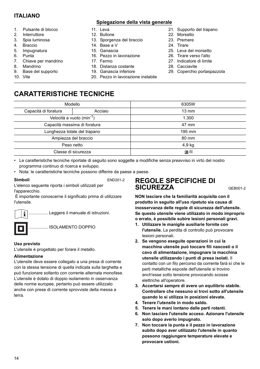 Supporto del trapano Morsetto Premere Tirare Leva del morsetto Tirare verso l'alto Indicatore di limite Cacciavite Coperchio portaspazzola CARATTERISTICHE TECNICHE Modello Capacità di foratura 6305W Acciaio 13 mm Velocità a vuoto (min-1)