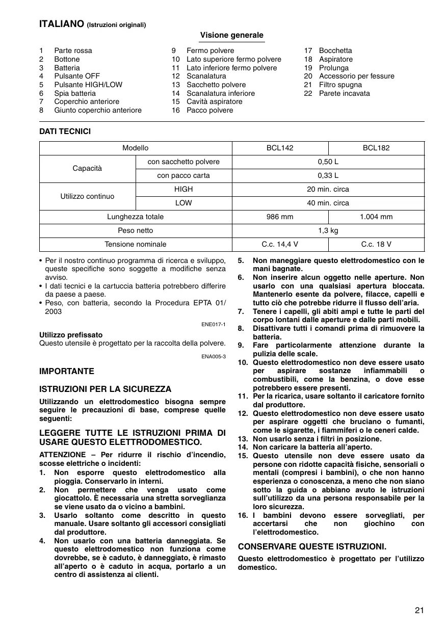 Bocchetta Aspiratore Prolunga Accessorio per fessure Filtro spugna Parete incavata DATI TECNICI Modello BCL142 BCL182 con sacchetto polvere 0,50 L con pacco carta 0,33 L HIGH 20 min. circa Capacità Utilizzo continuo LOW 40 min. circa Lunghezza totale 986 mm Peso netto