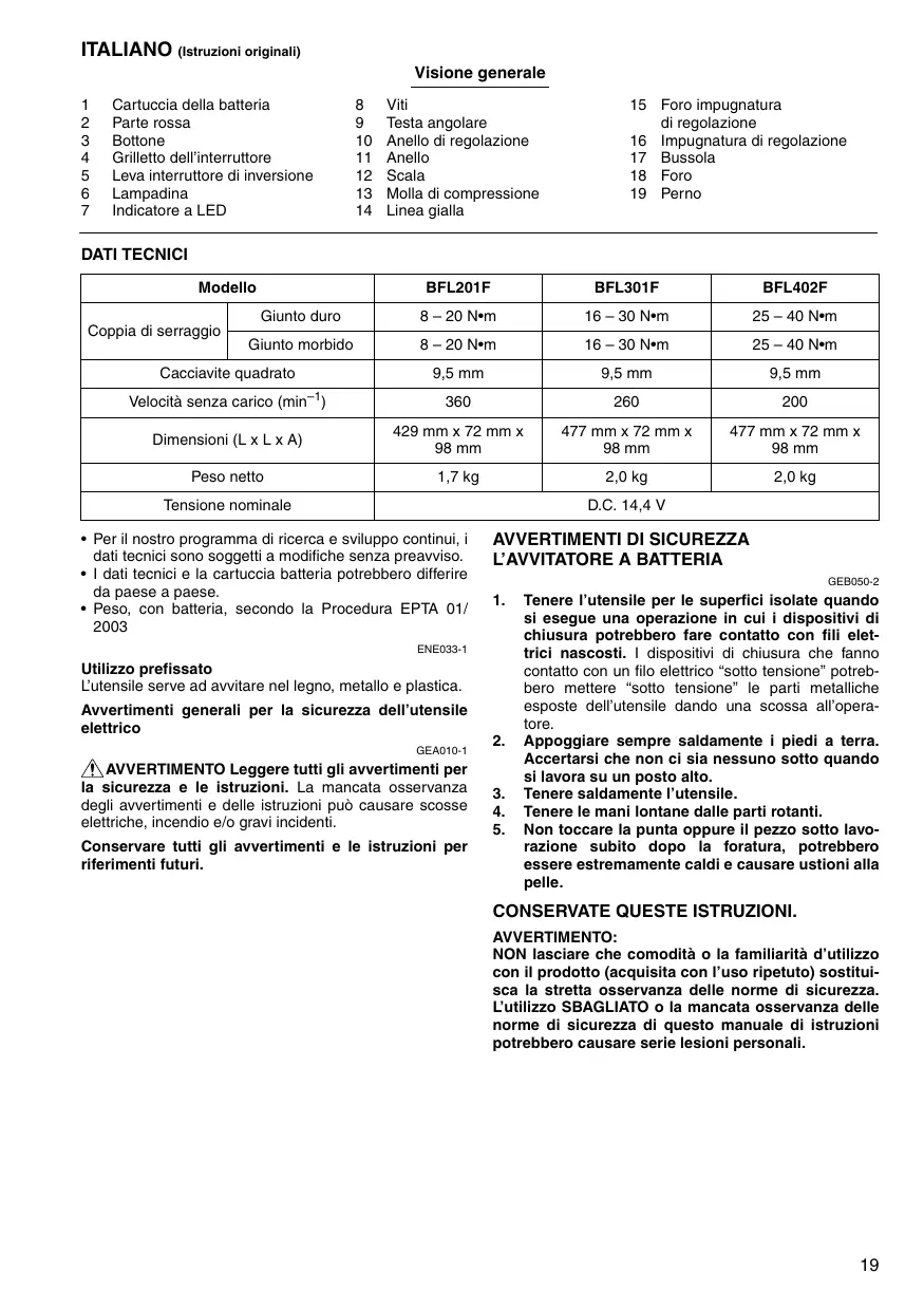ENE033-1 Utilizzo prefissato L’utensile serve ad avvitare nel legno, metallo e plastica. Avvertimenti generali per la sicurezza dell’utensile elettrico GEA010-1 AVVERTIMENTO Leggere tutti gli avvertimenti per la sicurezza e le istruzioni. La mancata osservanza degli avvertimenti e delle istruzioni può causare scosse elettriche, incendio e/o gravi incidenti. Conservare tutti gli avvertimenti e le istruzioni per riferimenti futuri.