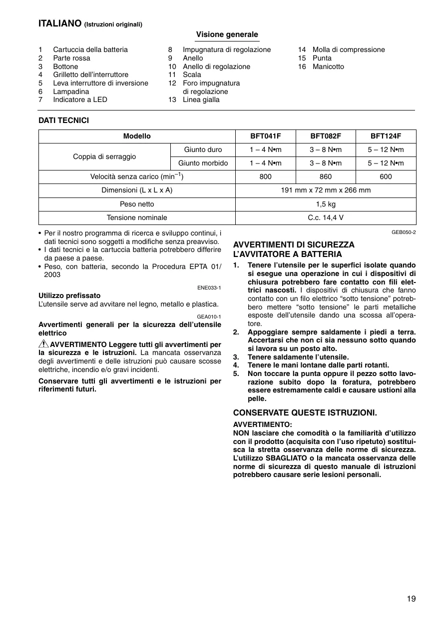 ENE033-1 Utilizzo prefissato L’utensile serve ad avvitare nel legno, metallo e plastica. GEA010-1 Avvertimenti generali per la sicurezza dell’utensile elettrico AVVERTIMENTO Leggere tutti gli avvertimenti per la sicurezza e le istruzioni. La mancata osservanza degli avvertimenti e delle istruzioni può causare scosse elettriche, incendio e/o gravi incidenti. Conservare tutti gli avvertimenti e le istruzioni per riferimenti futuri.