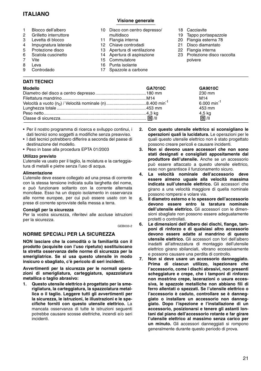 GA7010C Diamètre de la meule à moyeu déporté 180 mm Filetage de l’arbreM14 Vitesse à vide (n0) / Vitesse nominale (n) 8 400 min-1 Longueur totale453 mm Poids net4,3 kg Catégorie de sécurité • Poids selon la procédure EPTA 01/2003 Utilisations L’outil est conçu pour le meulage, le ponçage et la coupe des matériaux de métal et de pierre, sans utilisation d'eau. Alimentation L’outil ne devra être raccordé qu’à une alimentation de la même tension que celle qui figure sur la plaque signalétique, et il ne pourra fonctionner que sur un courant secteur monophasé. Réalisé avec une double isolation, il est conforme à la réglementation européenne et peut de ce fait être alimenté sans mise à la terre. Consignes de sécurité Pour votre propre sécurité, reportez-vous aux consignes de sécurité qui accompagnent l’outil.