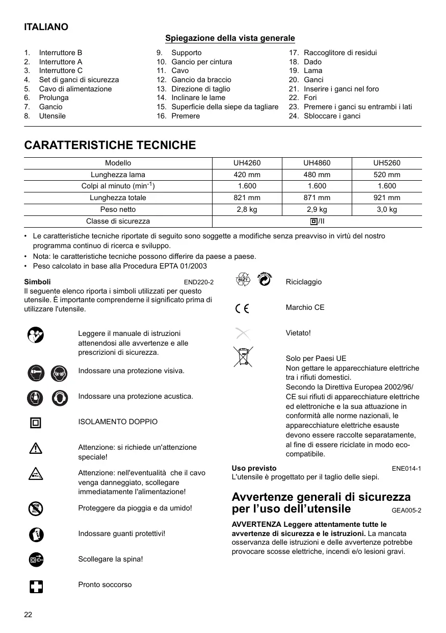 Riciclaggio Marchio CE Vietato! Solo per Paesi UE Non gettare le apparecchiature elettriche tra i rifiuti domestici. Secondo la Direttiva Europea 2002/96/ CE sui rifiuti di apparecchiature elettriche ed elettroniche e la sua attuazione in conformità alle norme nazionali, le apparecchiature elettriche esauste devono essere raccolte separatamente, al fine di essere riciclate in modo ecocompatibile. Uso previsto L'utensile è progettato per il taglio delle siepi. ENE014-1 Avvertenze generali di sicurezza GEA005-2 per l’uso dell’utensile AVVERTENZA Leggere attentamente tutte le avvertenze di sicurezza e le istruzioni. La mancata osservanza delle istruzioni e delle avvertenze potrebbe provocare scosse elettriche, incendi e/o lesioni gravi. Conservare le avvertenze e le istruzioni per riferimenti futuri. Il termine "utensile elettrico" utilizzato nelle avvertenze indica l'utensile ad alimentazione elettrica (con cavo) o a batteria (senza cavo). Sicurezza nell’area di lavoro