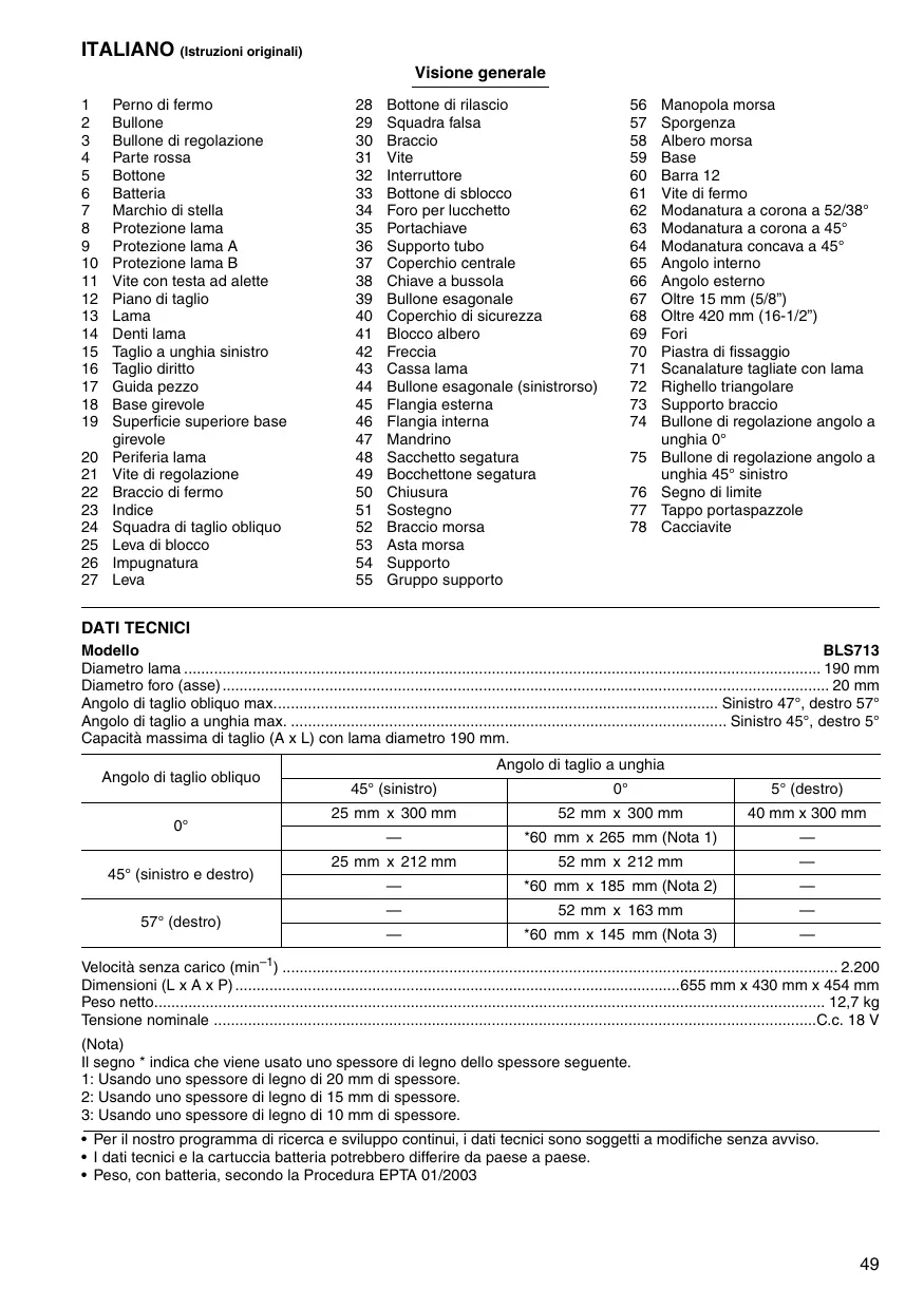 DATI TECNICI Modello BLS713 Diametro lama 190 mm Diametro foro (asse) 20 mm Angolo di taglio obliquo max Sinistro 47°, destro 57° Angolo di taglio a unghia max. Sinistro 45°, destro 5° Capacità massima di taglio (A x L) con lama diametro 190 mm. Angolo di taglio obliquo 0° 45° (sinistro e destro) 57° (destro)