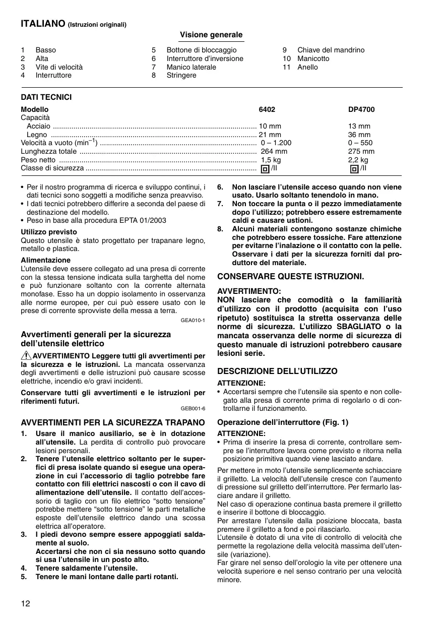 ITALIANO (struzioni originali) Bottone di bloccaggio 9 ne generale 1 Basso 5 Chiave del mandrino 2 Ala 6 Interruttore d'inversione 10 Manicotto 3 Vite di velocità 7 Manico laterale 11 Anello 4 Interruttore 8 Stringere DATI TECNICI Modello 6402 DP4700 Capacità Acciaio . 13 mm Legno 36 mm Velocità a vuoto (min”!) 0- 550 Lunghezza totale 275 mm Peso netto . 22kg Classe di sicurezza oi + Per il nostro programma di ricerca e sviluppo continui, i dati tecnici sono soggeti a modifiche senza preavviso. + I dati tecnici potrebbero differire a seconda del paese di destinazione del modello. + Peso in base alla procedura EPTA 01/2003 Utilizzo previsto Questo utensile à stato progettato per trapanare legno, metallo e plastica. Alimentazione L'utensile deve essere collegato ad una presa di corrente con la stessa tensione indicata sulla targhetta del nome e puè funzionare soltanto con la corrente alternata monofase. Esso ha un doppio isolamento in osservanza alle norme europee, per cui puè essere usato con le prese di corrente sprowviste della messa a terra. Goo Avvertimenti generali per la sicurezza dell'utensile elettrico AN AVVERTIMENTO Leggere tutti gli avvertimenti per la sicurezza e le istruzioni. La mancata osservanza degli avvertimenti e delle istruzioni pud causare scosse elettriche, incendio e/o gravi incidenti. Conservare tutti gli avvertimenti e le istruzioni per riferimenti futui GEsoots