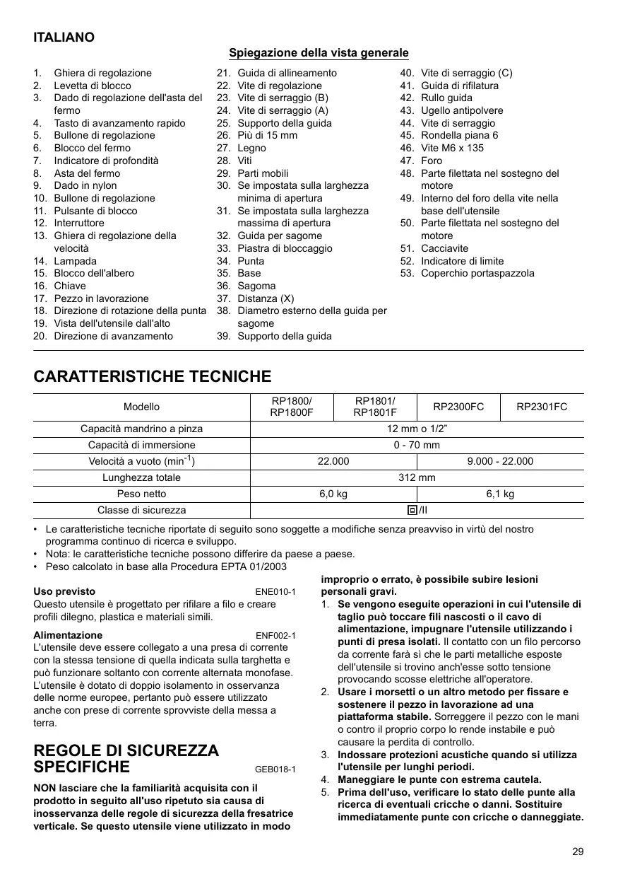 5. Perno de ajuste 25. Soporte de la guia 42. Rodillo guia 6. Bloque de tope 26. Més de 15 mm 43. Boquilla de polvo 7. Indicador de profundidad 27. Madera 44. Tomillo de apriete 8. Varilla de tope 28. Tornillos 45. Arandela plana 6 9. Tuerca de nylon 29. Môvil 46. Torillo M6 x 135 10. Perno de ajuste 30. Cuando se ajusta en el ancho de 47. Orificio 11. Botôn de bloqueo apertura minimo 48. Parte con rosca del soporte del 12. Interruptor disparador 31. Cuando se ajusta en el ancho de motor 13. Dial de regulaciôn de la velocidad apertura mäximo 49. Interior del orificio para el tomill 14. Lämpara 32. Guia para plantilla de la base de la herramienta 15. Bloqueo del eje 33. Placa de bloqueo 50. Parte con rosca del soporte del 16. Liave 34. Fresa motor 17. Pieza de trabajo 35. Base 51. Destornillador 18. Direcciôn de giro de la fresa 36. Plantila 52. Marca de limite 19. Vista desde la parte superior de la 37. Distancia (X) 53. Tapa del portaescobillas herramienta ESPECIFICACIONES RP1800/ RP1801/ Modelo RP 1800 RPABOIE RP2300FC RP2301FC Capacidad de boquilla 12 mm o 12° Capacidad de penetraciôn 0-70 mm Velocidad en vacio (min 1) 22.000 Ï 9.000 - 22.000 Observe si se producen vibraciones u oscilaciones, puesto que son sintomas de que la fresa no se ha instalado correctamente.