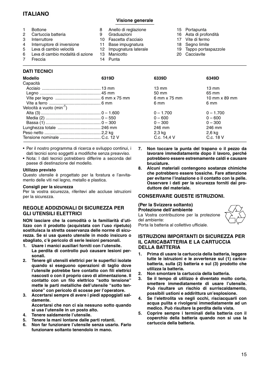 ITALIANO Visione generale 1 Bottone 8 Anello di reglazione 15 Portapunta 2 Cartuccia batteria 9 Graduazioni 16 Asta di profondità 3 Interruttore 10 Fascetta d'acciaio 17 Vite di fermo 4 _ Interruptore di inversione 11 Base impugnatura 18 Segno limite 5 Leva di cambio velocità 12 Impugnatura laterale 19 Tappo portaspazzole 6 Leva di cambio modalità diazione 13 Manicotto 20 Cacciavite 7 Freccia 14 Punta DATI TECNICI Modello 6339D 6349D Capacità Acciaio 13 mm 13 mm Legno 50 mm 65 mm Vite per legno 6 mm x 75 mm 10 mm x 89 mm Vite a ferro 6mm 6mm Velocità a vuoto (min!) Alta (3). 0-1.700 0-—1.700 Media (2) . 0- 600 0600 Bassa (1). 0- 300 0- 300 Lunghezza totale 246 mm 246 mm Peso netto … 2,3kg 2,6kg Tensione nominale C.c. 144 V C.c. 18V + Per il nostro programma di ricerca e sviluppo continui, i dati tecnici sono soggetti a modifiche senza preavviso. + Nota: | dati tecnici potrebbero differire a seconda del paese di destinazione del modello. Utilizzo previsto Questo utensile à progettato per la foratura e l'avvita- mento delle viti nel legno, metallo e plastica. Consigli per la sicurezza Per la vostra sicurezza, riferitevi alle accluse istruzioni per la sicurezza.