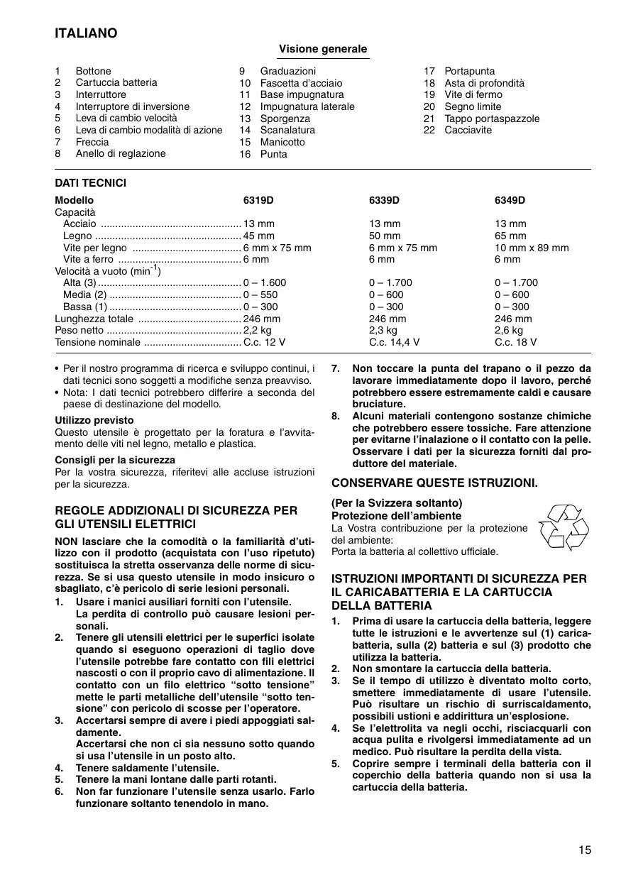 DICHIARAZIONE DI CONFORMITÀ CON LE NORME DELLA COMUNITÀ EUROPEA Modello; 6319D, 6339D, 6349D Dichiariamo sotto la nostra sola responsabilità che questo prodotto è conforme agli standard di documenti standardizzati seguenti: EN60745, EN55014 secondo le direttive del Consiglio 2004/108/CE e 98/37/ CE.