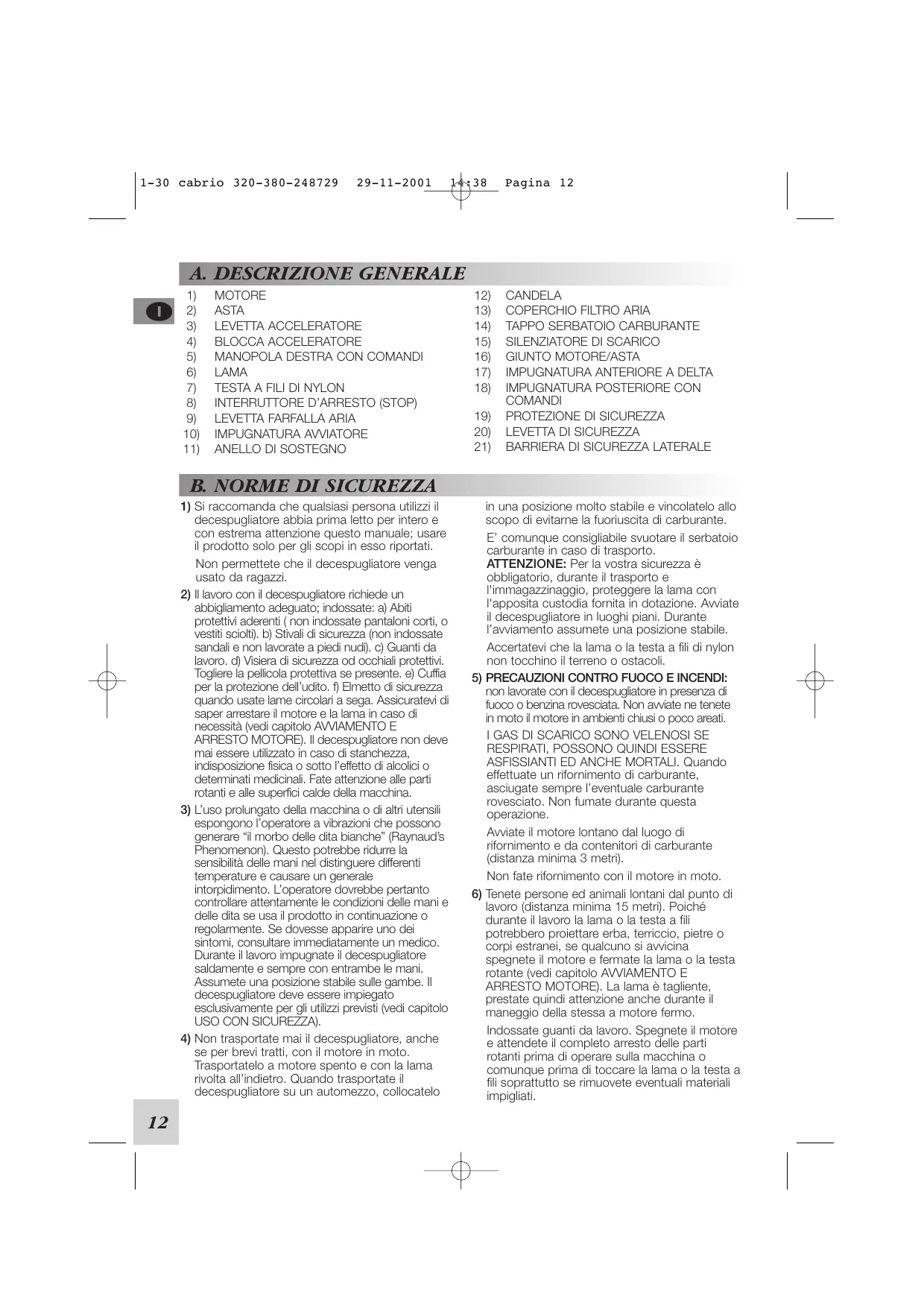lavoro (distanza minima 15 metri). Poiché durante il lavoro la lama o la testa a fili potrebbero proiettare erba, terriccio, pietre o corpi estranei, se qualcuno si avvicina spegnete il motore e fermate la lama o la testa rotante (vedi capitolo AVVIAMENTO E ARRESTO MOTORE). La lama è tagliente, prestate quindi attenzione anche durante il maneggio della stessa a motore fermo. Indossate guanti da lavoro. Spegnete il motore e attendete il completo arresto delle parti rotanti prima di operare sulla macchina o comunque prima di toccare la lama o la testa a fili soprattutto se rimuovete eventuali materiali impigliati. 1-30 cabrio 320-380-248729 29-11-2001