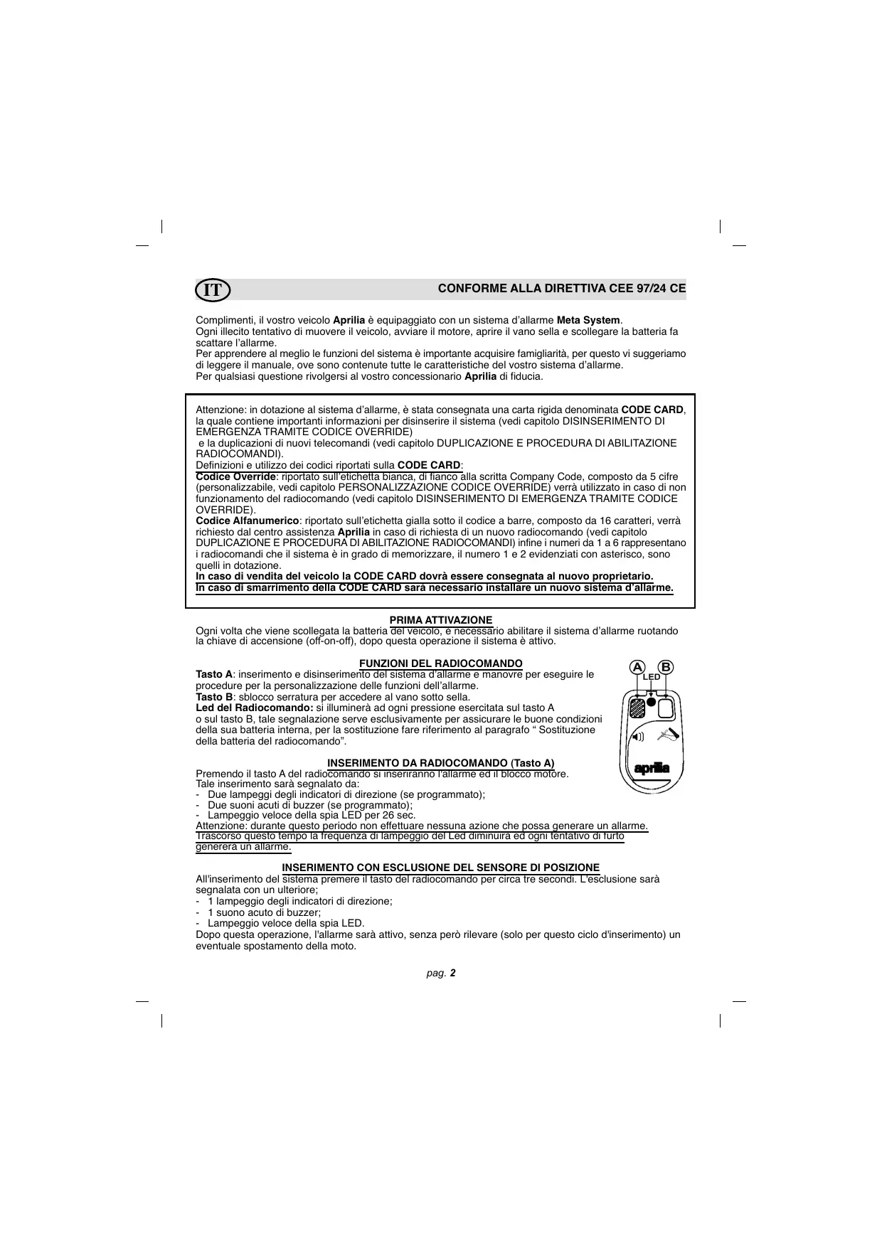 IT CONFORME ALLA DIRETTIVA CEE 97/24 CE Complimenti, il vostro veicolo Aprilia è equipaggiato con un sistema d’allarme Meta System. Ogni illecito tentativo di muovere il veicolo, avviare il motore, aprire il vano sella e scollegare la batteria fa scattare l’allarme. Per apprendere al meglio le funzioni del sistema è importante acquisire famigliarità, per questo vi suggeriamo di leggere il manuale, ove sono contenute tutte le caratteristiche del vostro sistema d’allarme. Per qualsiasi questione rivolgersi al vostro concessionario Aprilia di fiducia. Attenzione: in dotazione al sistema d’allarme, è stata consegnata una carta rigida denominata CODE CARD, la quale contiene importanti informazioni per disinserire il sistema (vedi capitolo DISINSERIMENTO DI EMERGENZA TRAMITE CODICE OVERRIDE) e la duplicazioni di nuovi telecomandi (vedi capitolo DUPLICAZIONE E PROCEDURA DI ABILITAZIONE RADIOCOMANDI). Definizioni e utilizzo dei codici riportati sulla CODE CARD: Codice Override: riportato sull’etichetta bianca, di fianco alla scritta Company Code, composto da 5 cifre (personalizzabile, vedi capitolo PERSONALIZZAZIONE CODICE OVERRIDE) verrà utilizzato in caso di non funzionamento del radiocomando (vedi capitolo DISINSERIMENTO DI EMERGENZA TRAMITE CODICE OVERRIDE). Codice Alfanumerico: riportato sull’etichetta gialla sotto il codice a barre, composto da 16 caratteri, verrà richiesto dal centro assistenza Aprilia in caso di richiesta di un nuovo radiocomando (vedi capitolo DUPLICAZIONE E PROCEDURA DI ABILITAZIONE RADIOCOMANDI) infine i numeri da 1 a 6 rappresentano i radiocomandi che il sistema è in grado di memorizzare, il numero 1 e 2 evidenziati con asterisco, sono quelli in dotazione. In caso di vendita del veicolo la CODE CARD dovrà essere consegnata al nuovo proprietario. In caso di smarrimento della CODE CARD sarà necessario installare un nuovo sistema d’allarme. PRIMA ATTIVAZIONE Ogni volta che viene scollegata la batteria del veicolo, è necessario abilitare il sistema d’allarme ruotando la chiave di accensione (off-on-off), dopo questa operazione il sistema è attivo. FUNZIONI DEL RADIOCOMANDO Tasto A: inserimento e disinserimento del sistema d’allarme e manovre per eseguire le procedure per la personalizzazione delle funzioni dell’allarme. Tasto B: sblocco serratura per accedere al vano sotto sella. Led del Radiocomando: si illuminerà ad ogni pressione esercitata sul tasto A o sul tasto B, tale segnalazione serve esclusivamente per assicurare le buone condizioni della sua batteria interna, per la sostituzione fare riferimento al paragrafo “ Sostituzione della batteria del radiocomando”. INSERIMENTO DA RADIOCOMANDO (Tasto A) Premendo il tasto A del radiocomando si inseriranno l'allarme ed il blocco motore. Tale inserimento sarà segnalato da: - Due lampeggi degli indicatori di direzione (se programmato); - Due suoni acuti di buzzer (se programmato); - Lampeggio veloce della spia LED per 26 sec. Attenzione: durante questo periodo non effettuare nessuna azione che possa generare un allarme. Trascorso questo tempo la frequenza di lampeggio del Led diminuirà ed ogni tentativo di furto genererà un allarme. INSERIMENTO CON ESCLUSIONE DEL SENSORE DI POSIZIONE All'inserimento del sistema premere il tasto del radiocomando per circa tre secondi. L'esclusione sarà segnalata con un ulteriore; - 1 lampeggio degli indicatori di direzione; - 1 suono acuto di buzzer; - Lampeggio veloce della spia LED. Dopo questa operazione, l'allarme sarà attivo, senza però rilevare (solo per questo ciclo d'inserimento) un eventuale spostamento della moto. pag. 2