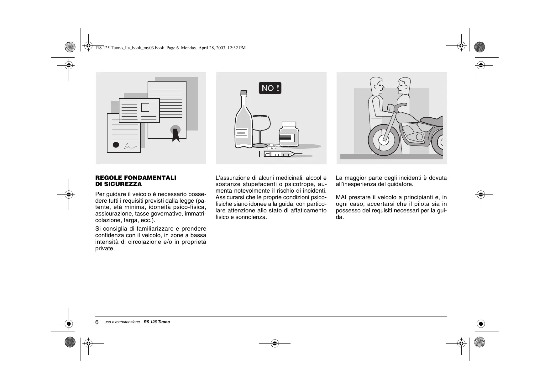 RS 125 Tuono_Fra_book_my03.book Page 7 Monday, April 28, 2003 12:19 PM Respecter rigoureusement la signalisation et les normes sur la circulation routière nationale et locale.