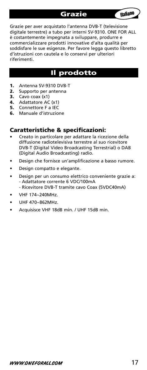 Grazie per aver acquistato l’antenna DVB-T (televisione digitale terrestre) a tubo per interni SV-9310. ONE FOR ALL è costantemente impegnata a sviluppare, produrre e commercializzare prodotti innovative d’alta qualità per soddisfare le sue esigenze. Per favore legga questo libretto d’istruzioni con cautela e lo conservi per ulteriori riferimenti.