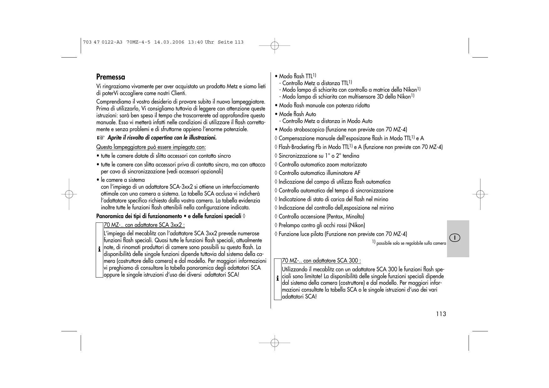 70 MZ... con adattatore SCA 3xx2: L'impiego del mecablitz con l'adattatore SCA 3xx2 preveDE numerose funzioni flash speciali. Quasi tutte le funzioni flash speciali, attualmente note, di rimonati produttori di camere sono possibili su quello flash. La disponibilità delle singole funzioni dipende tuttavia dalsystema della camera (costrutto della camera) e dal modello. Per maggiori informazioni vi preghiamo di consultare la tabella panorama degli adattatori SCA oppure le singole istruzioni d'uso dei diversi adattatori SCA!