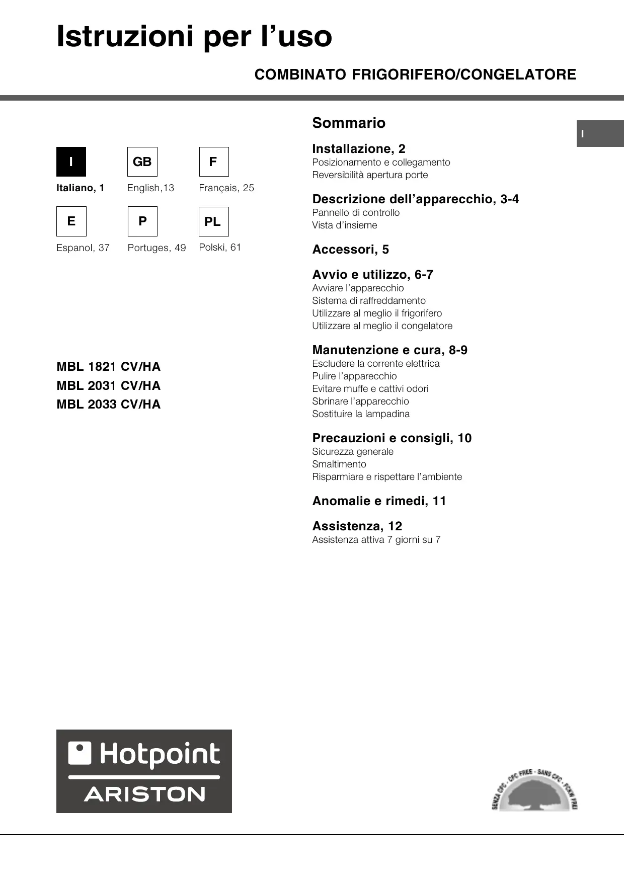 Scarica le istruzioni per il tuo Frigorifero in formato PDF gratuitamente! Trova il tuo manuale MBL 2031 CV - HOTPOINT-ARISTON e riprendi in mano il tuo dispositivo elettronico. In questa pagina sono pubblicati tutti i documenti necessari per l'utilizzo del tuo dispositivo. MBL 2031 CV del marchio HOTPOINT-ARISTON.