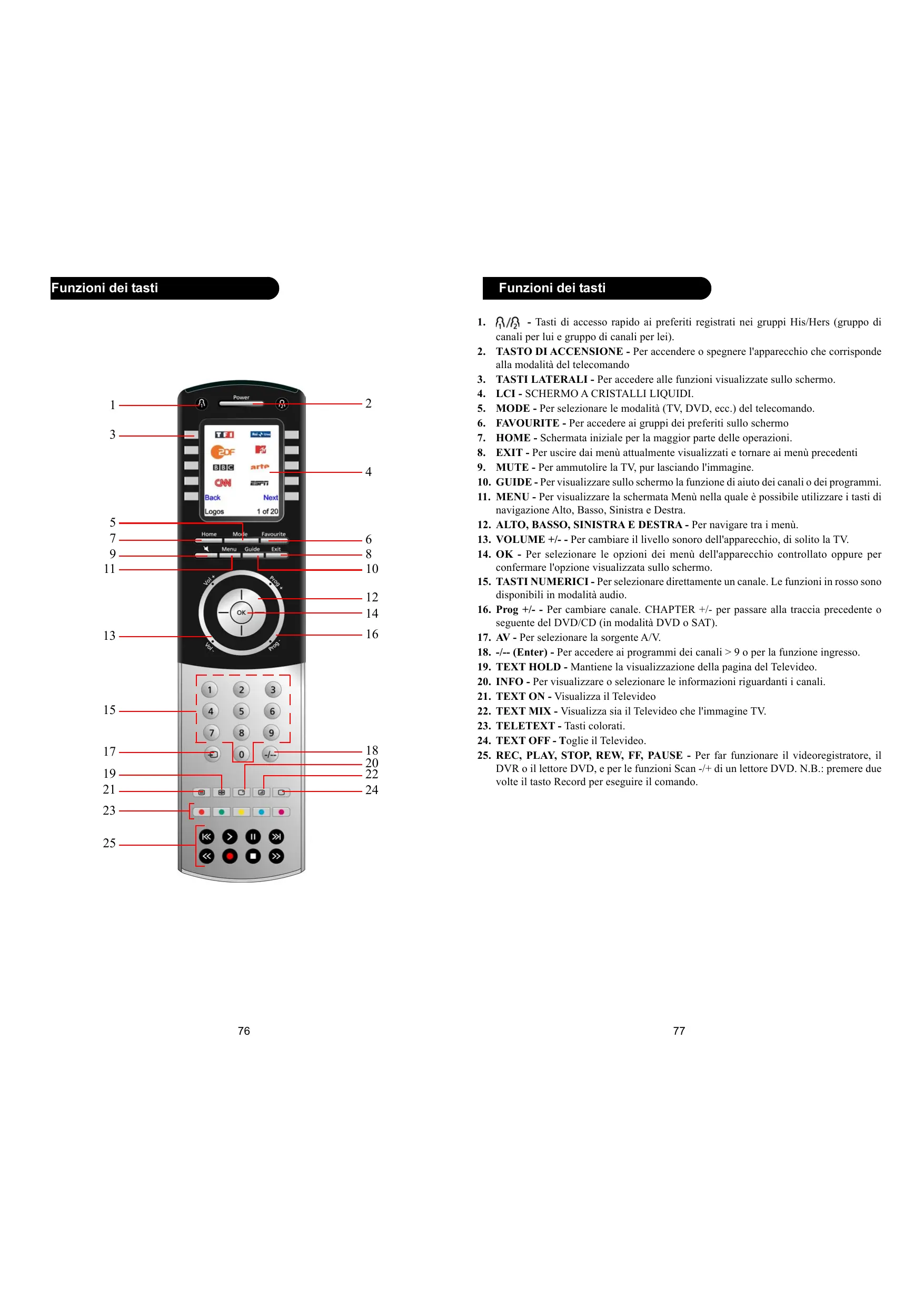 - Tasti di accesso rapido ai preferiti registrati nei gruppi His/Hers (gruppo di canali per lui e gruppo di canali per lei). TASTO DI ACCENSIONE - Per accendere o spegnere l'apparecchio che corrisponde alla modalità del telecomando TASTI LATERALI - Per accedere alle funzioni visualizzate sullo schermo. LCI - SCHERMO A CRISTALLI LIQUIDI. MODE - Per selezionare le modalità (TV, DVD, ecc.) del telecomando. FAVOURITE - Per accedere ai gruppi dei preferiti sullo schermo HOME - Schermata iniziale per la maggior parte delle operazioni. EXIT - Per uscire dai menù attualmente visualizzati e tornare ai menù precedenti MUTE - Per ammutolire la TV, pur lasciando l'immagine. GUIDE - Per visualizzare sullo schermo la funzione di aiuto dei canali o dei programmi. MENU - Per visualizzare la schermata Menù nella quale è possibile utilizzare i tasti di navigazione Alto, Basso, Sinistra e Destra. ALTO, BASSO, SINISTRA E DESTRA - Per navigare tra i menù. VOLUME +/- - Per cambiare il livello sonoro dell'apparecchio, di solito la TV. OK - Per selezionare le opzioni dei menù dell'apparecchio controllato oppure per confermare l'opzione visualizzata sullo schermo. TASTI NUMERICI - Per selezionare direttamente un canale. Le funzioni in rosso sono disponibili in modalità audio. Prog +/- - Per cambiare canale. CHAPTER +/- per passare alla traccia precedente o seguente del DVD/CD (in modalità DVD o SAT). AV - Per selezionare la sorgente A/V. -/-- (Enter) - Per accedere ai programmi dei canali > 9 o per la funzione ingresso. TEXT HOLD - Mantiene la visualizzazione della pagina del Televideo. INFO - Per visualizzare o selezionare le informazioni riguardanti i canali. TEXT ON - Visualizza il Televideo TEXT MIX - Visualizza sia il Televideo che l'immagine TV. TELETEXT - Tasti colorati. TEXT OFF - Toglie il Televideo. REC, PLAY, STOP, REW, FF, PAUSE - Per far funzionare il videoregistratore, il DVR o il lettore DVD, e per le funzioni Scan -/+ di un lettore DVD. N.B.: premere due volte il tasto Record per eseguire il comando.