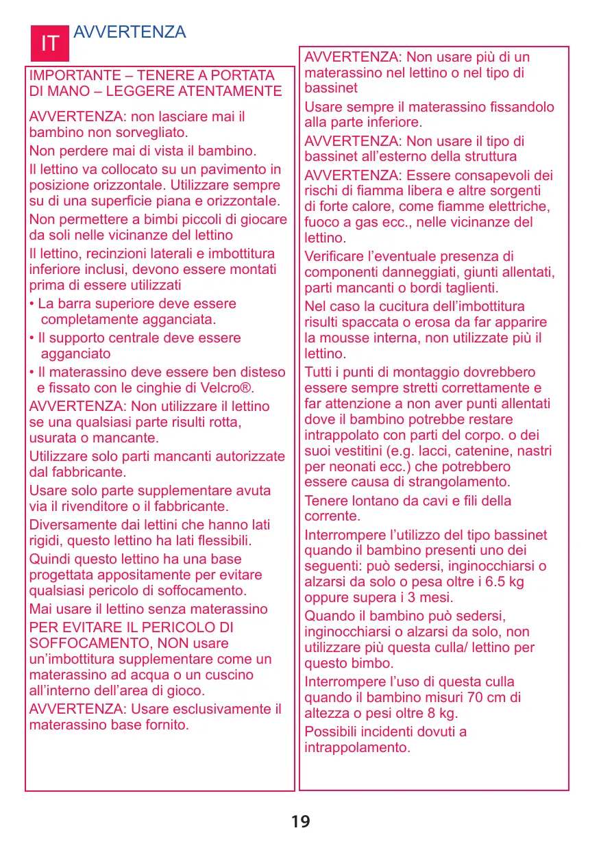 AVERTISSEMENT: Ne pas utiliser plus d’un matelas à la fois dans le berceau ou dans le rehausseur de matelas. Toujours utiliser le matelas sommier fourni, en le fixant avec les sangles situées en dessous. AVERTISSEMENT: Ne pas utiliser le rehausseur de matelas hors du berceau AVERTISSEMENT: Attention aux accidents liés aux flammes et autres sources de forte chaleur telles que radiateurs électriques, ou radiateurs à gaz, dans le voisinage du berceau. Vérifier le berceau pour détecter les parties abimées ou manquantes, et les bords acérés. Si les bords rembourrés sont déchirés et donnent un accès au rembourrage il faut arrêter d’utiliser le berceau. Tous les dispositifs de fixation doivent être correctement attachés. Faire attention à ce que le bébé n’ait pas une partie de son corps ou de ses vêtements (rubans, colliers) coincés, entrainant un risque d’étranglement. Mettre le berceau loin des cordons de téléphones ou de fils électriques. Arrêtez d’utiliser le rehausseur de matelas lorsque l’enfant vérifie une des conditions suivantes: l’enfant peut s’asseoir, se mettre à genoux ou se redresser tout seul, ou, à partir du moment où il pèse plus de 6,5 kg ou a plus de 3 mois. Lorsqu’un enfant est capable de s’asseoir, ou de se mettre à genoux, ou de se redresser tout seul, le berceau ne doit plus être utilisé pour cet enfant. Arrêtez d’utiliser le berceau lorsque l’enfant mesure 70 cm ou pèse plus de 8kg.