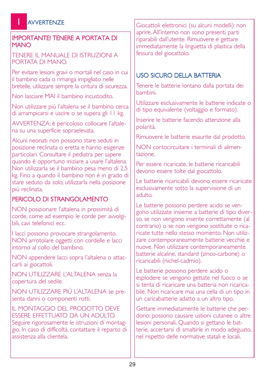 Les cordons présentent un risque de strangulation. Ne pas placer autour du cou de votre enfant des objets ayant des cordons, comme un capuchon ou une tétine. NE PAS laisser pendre de cordons au dessus de la balançoire ou attacher de cordons aux jouets.