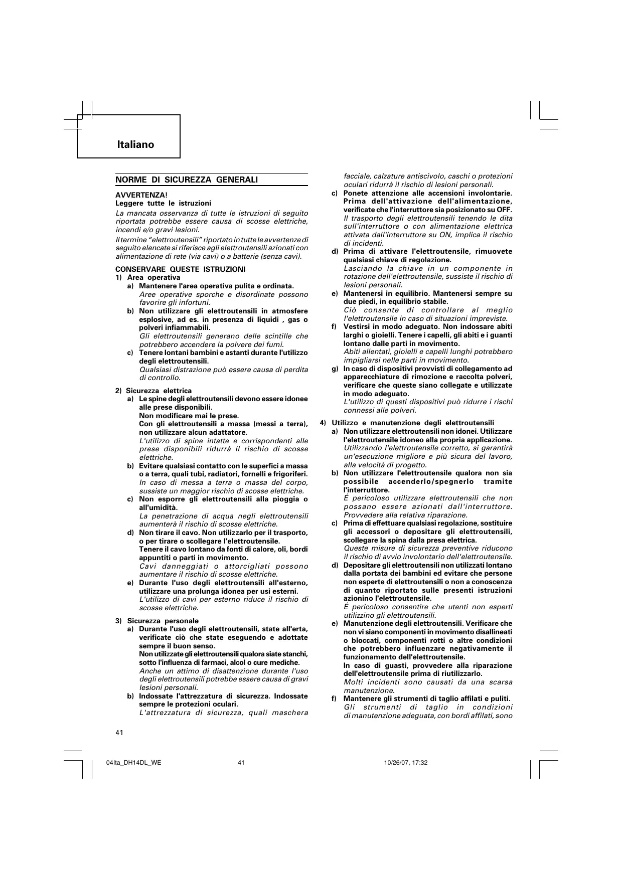 10/26/07, 17:32 Italiano meno soggetti al bloccaggio e sono più facilmente controllabili. g) Utilizzare l'elettroutensile, gli accessori, le barrette, ecc. in conformità a quanto riportato nelle presenti istruzioni e secondo l'uso preposto, tenendo in debita considerazione le condizioni operative e il tipo di lavoro da eseguire. L'utilizzo di elettroutensili per operazioni diverse da quanto previsto, può essere causa di situazioni pericolose.