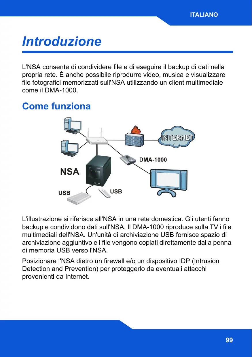 L'illustrazione si riferisce all'NSA in una rete domestica. Gli utenti fanno backup e condividono dati sull'NSA. Il DMA-1000 riproduce sulla TV i file multimediali dell'NSA. Un'unità di archiviazione USB fornisce spazio di archiviazione aggiuntivo e i file vengono copiati direttamente dalla penna di memoria USB verso l'NSA. Posizionare l'NSA dietro un firewall e/o un dispositivo IDP (Intrusion Detection and Prevention) per proteggerlo da eventuali attacchi provenienti da Internet.