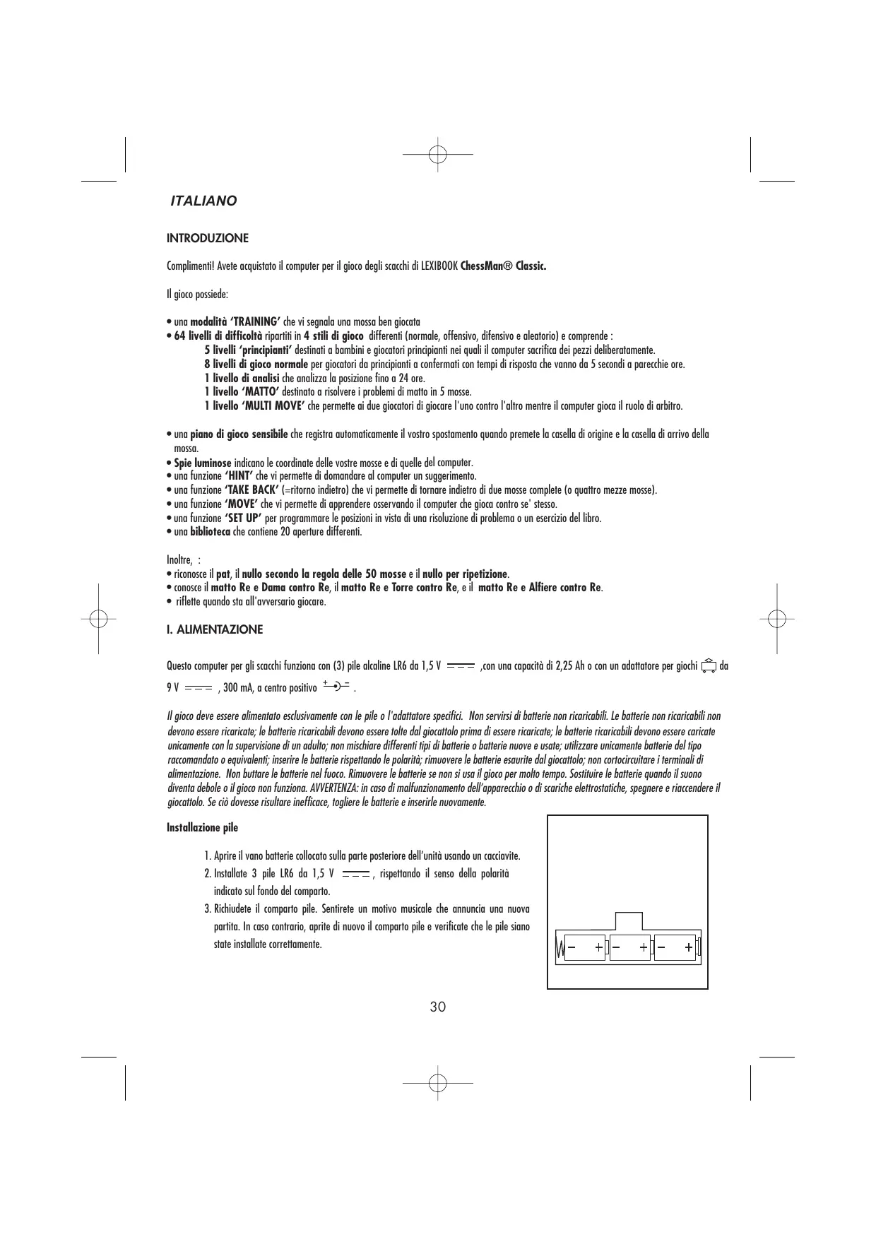 • 64 niveaux de difficulté répartis en 4 styles de jeu différents (normal, agressif, défensif et aléatoire) et comprenant : 5 niveaux ‘débutant’ destiné aux enfants et aux joueurs débutants dans lesquels l’ordinateur sacrifie des pièces délibérément 8 niveaux de jeu normaux pour joueurs débutants à confirmés avec des temps de réponse allant de 5 secondes à plusieurs heures 1 niveau d’analyse qui analyse la position jusqu’à 24 heures durant 1 niveau ‘MAT’ destiné à résoudre des problèmes de mat jusqu’au mat en 5 coups 1 niveau ‘MULTI MOVE’ permettant à deux joueurs de jouer l’un contre l’autre tandis que l’ordinateur joue un rôle d’arbitre. • un plateau de jeu sensitif qui enregistre automatiquement votre déplacement lorsque vous appuyez sur la case d'origine et sur la case d'arrivée du coup. • des voyants indiquant les coordonnées de vos coups et de ceux de l'ordinateur. • une fonction ‘HINT’ par laquelle vous demandez à l'ordinateur de suggérer votre prochain coup. • une fonction ‘TAKE BACK’ (=retour en arrière) qui vous permet de revenir jusqu'à deux coups en arrière complets (soit quatre demi-coups). • une fonction ‘MOVE’ qui vous permet d'apprendre en regardant l'ordinateur jouer contre lui-même. • une fonction ‘SET UP’ pour programmer des positions en vue de résoudre un problème ou un exercice du livre • une bibliothèque contenant 20 ouvertures différentes De plus, il : • détecte le pat, le nul selon la règle des 50 coups et le nul par répétition. • connaît le mat Roi et Dame contre Roi, le mat Roi et Tour contre Roi, et le mat Roi et Fous contre Roi. • réfléchit quand c'est à l'adversaire de jouer. I. ALIMENTATION Cet ordinateur d'échecs fonctionne avec (3) piles alcalines LR6 de 1,5 V de 9 V , 300 mA, à centre positif