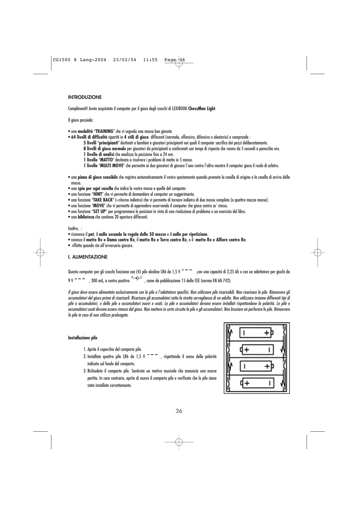 CG1500 8 Lang-2004 23/02/04 11:55 Page 36 INTRODUZIONE Complimenti! Avete acquistato il computer per il gioco degli scacchi di LEXIBOOK ChessMan Light. Il gioco possiede: