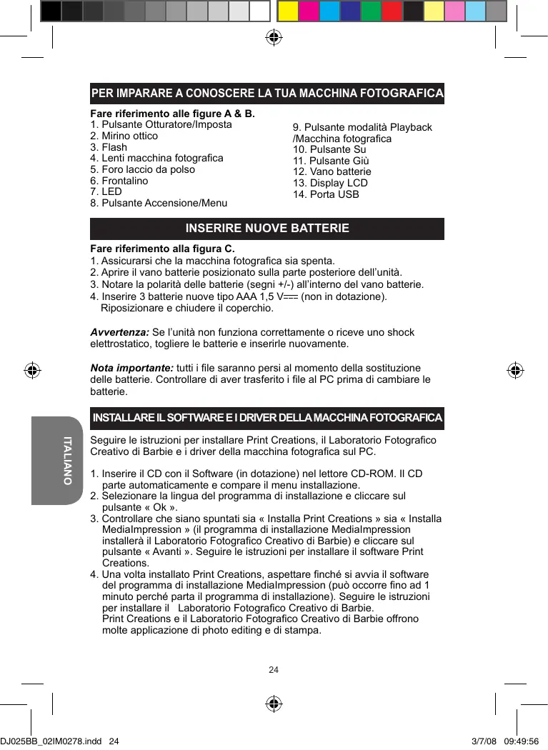 (non in dotazione). Riposizionare e chiudere il coperchio. Avvertenza: Se l’unità non funziona correttamente o riceve uno shock elettrostatico, togliere le batterie e inserirle nuovamente. Nota importante: tutti i file saranno persi al momento della sostituzione delle batterie. Controllare di aver trasferito i file al PC prima di cambiare le batterie. INSTALLARE IL SOFTWARE E I DRIVER DELLA MACCHINA FOTOGRAFICA ITALIANO Seguire le istruzioni per installare Print Creations, il Laboratorio Fotografico Creativo di Barbie e i driver della macchina fotografica sul PC.