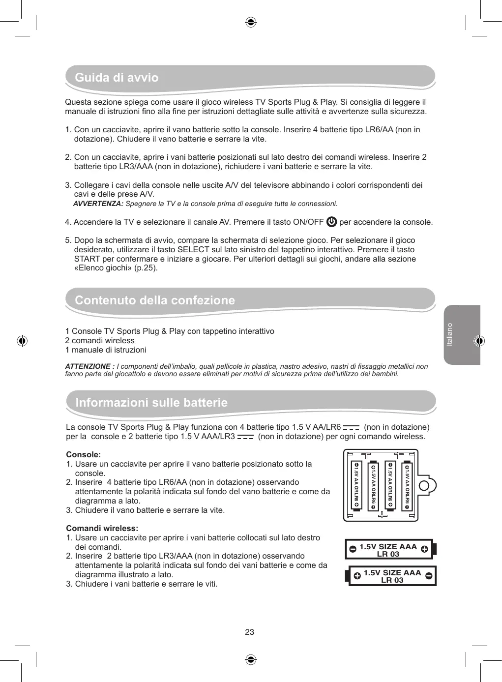 desiderato, utilizzare il tasto SELECT sul lato sinistro del tappetino interattivo. Premere il tasto START per confermare e iniziare a giocare. Per ulteriori dettagli sui giochi, andare alla sezione «Elenco giochi» (p.25). Italiano Contenuto della confezione 1 Console TV Sports Plug & Play con tappetino interattivo 2 comandi wireless 1 manuale di istruzioni ATTENZIONE : I componenti dell’imballo, quali pellicole in plastica, nastro adesivo, nastri di fissaggio metallici non fanno parte del giocattolo e devono essere eliminati per motivi di sicurezza prima dell’utilizzo dei bambini. Informazioni sulle batterie La console TV Sports Plug & Play funziona con 4 batterie tipo 1.5 V AA/LR6 (non in dotazione) per la console e 2 batterie tipo 1.5 V AAA/LR3 (non in dotazione) per ogni comando wireless.